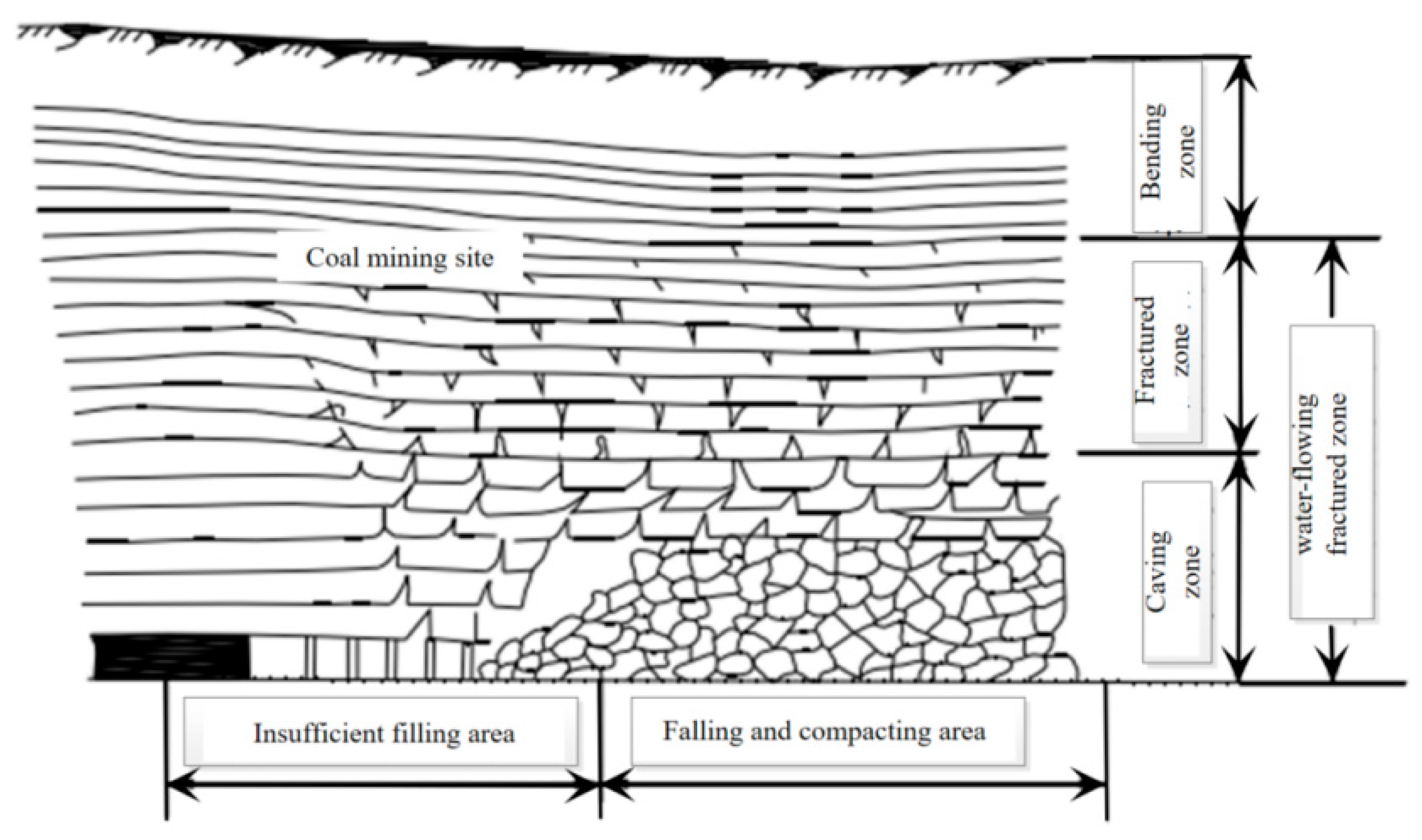 The theoretical calculation methods for determining the height of overburden failure in coal mining—primarily the caved zone and the water-conducting fracture zone—have evolved over many years, leading to the establishment of several commonly used approaches. These methods vary in emphasis and are often applied in combination for mutual validation in practice. Extensive in situ measurements have revealed that the development height of the water-conducting fracture zone is significantly influenced by lithology [31]. Based on a large amount of measured data from high-intensity mining operations, some researchers have studied calculation methods for predicting the heights of the caved zone and the water-conducting fracture zone (Table 1). After the underground coal seam is extracted, the original stress balance of the rock mass above it is disrupted, leading to movement, deformation, and failure. Consequently, a caving zone, a fracture zone, and a bending subsidence zone form from bottom to top. The direct cause is that the mined-out area causes the immediate roof to lose support, resulting in fracture, crushing, and chaotic accumulation, forming the caving zone. The overlying strata, such as the main roof, generate tensile stress and interlayer shear stress exceeding their tensile strength during the bending subsidence process, forming a large number of vertical tension fractures and bedding fractures, which develop into the fracture zone. The strata above this only undergo overall, continuous, slow bending until the surface, forming the bending subsidence zone. This “three-zone” structure is an inevitable result of the rock mass seeking a new mechanical equilibrium under the redistribution of mining-induced stress. A schematic diagram of the typical “Three Zones” distribution resulting from coal mining is shown in Figure 4.