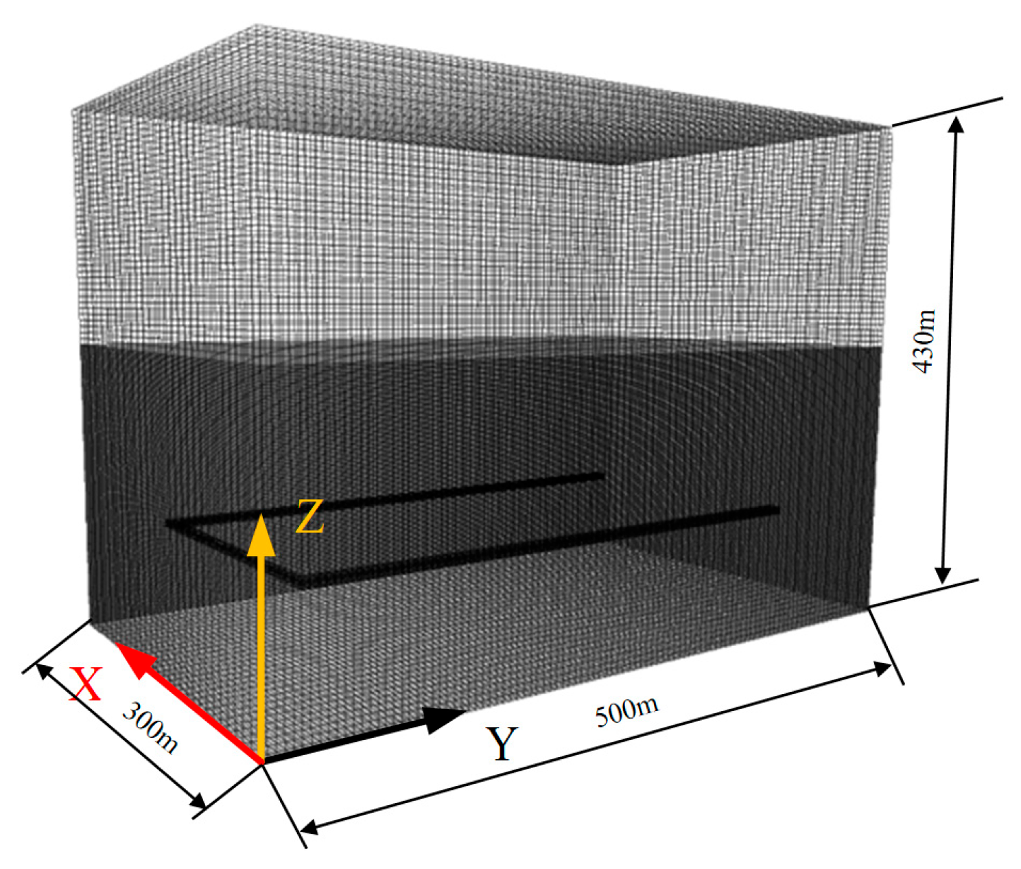 Based on borehole data and the geological column of the E9103 working face in Hengjin Mine, a three-dimensional numerical model was established. The panel has a dip length of 190 m with an average coal seam thickness of 4.5 m. In the model, the working face is oriented along the dip direction (Y-axis), with advancement along the strike (X-axis). The gravitational direction is aligned with the Z-axis, upward being positive. To minimize boundary effects on simulation results, 50 m protective coal pillars were reserved on both sides along the strike and dip directions of the E9103 panel. The simulated dimensions of the working face include a dip length of 190 m, a mining height of 4.5 m, and a seam dip angle of 16°. The advancement length was set to twice the panel length (380 m). The model incorporates 12 rock layers in the floor with a total thickness of 90 m, and 29 overburden layers with a total thickness of 334 m. Considering the widths of both the haulage roadway and ventilation roadway (4 m each), the overall dimensions of the 3D model are 500 m (strike) × 300 m (dip) × 430 m (height). For simplification, the overburden load was applied as a uniformly distributed stress on the top boundary, while displacement boundary conditions were assigned to the sides and bottom of the model. The elevation of the coal seam floor in the E9103 panel ranges from 1140 m to 1193 m. Given an overburden thickness of 334 m, a vertical stress of 8.08 MPa was applied to the top surface of the model. An elastic-perfectly plastic constitutive model was adopted, with failure behavior defined by the Mohr–Coulomb criterion.