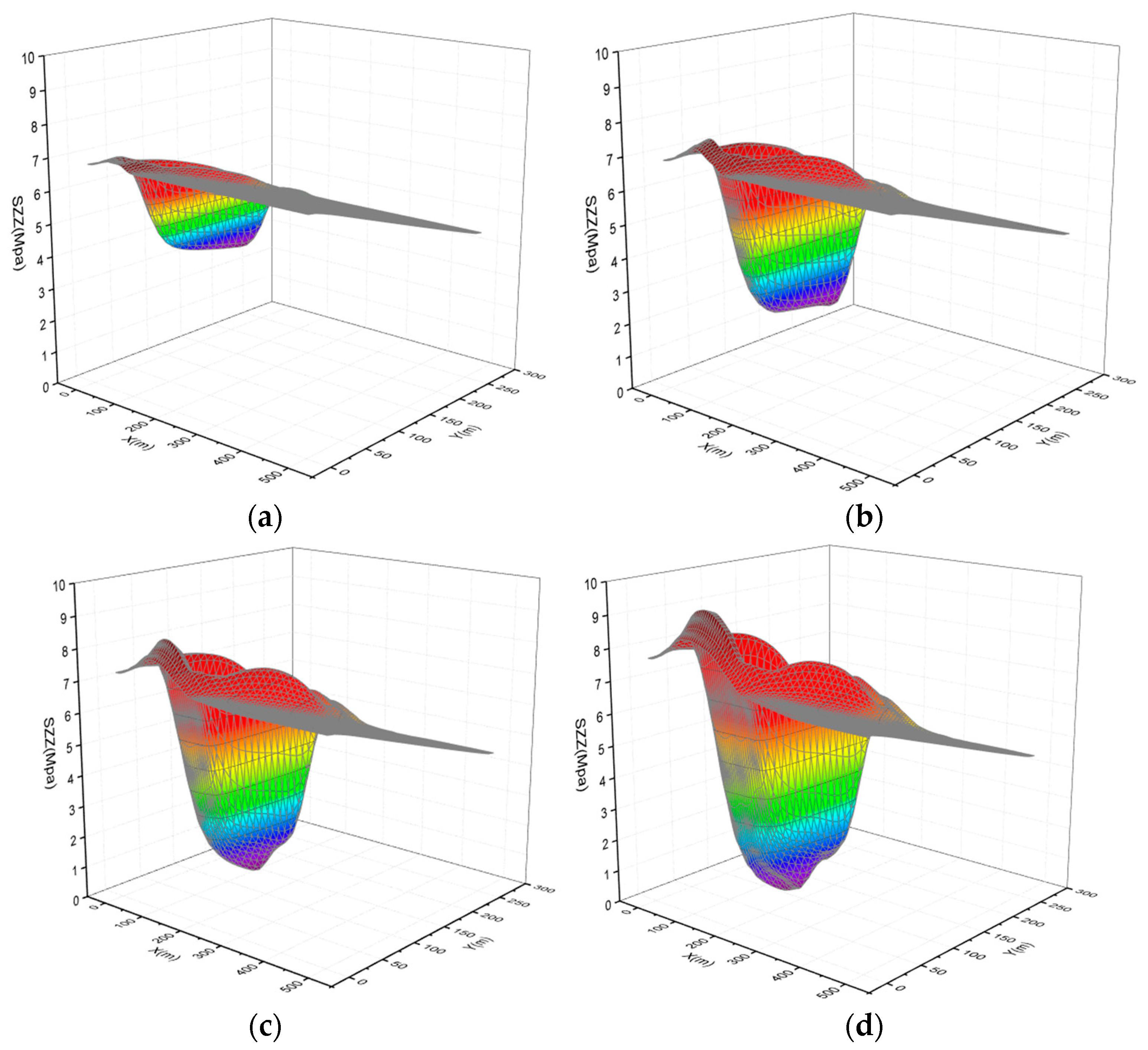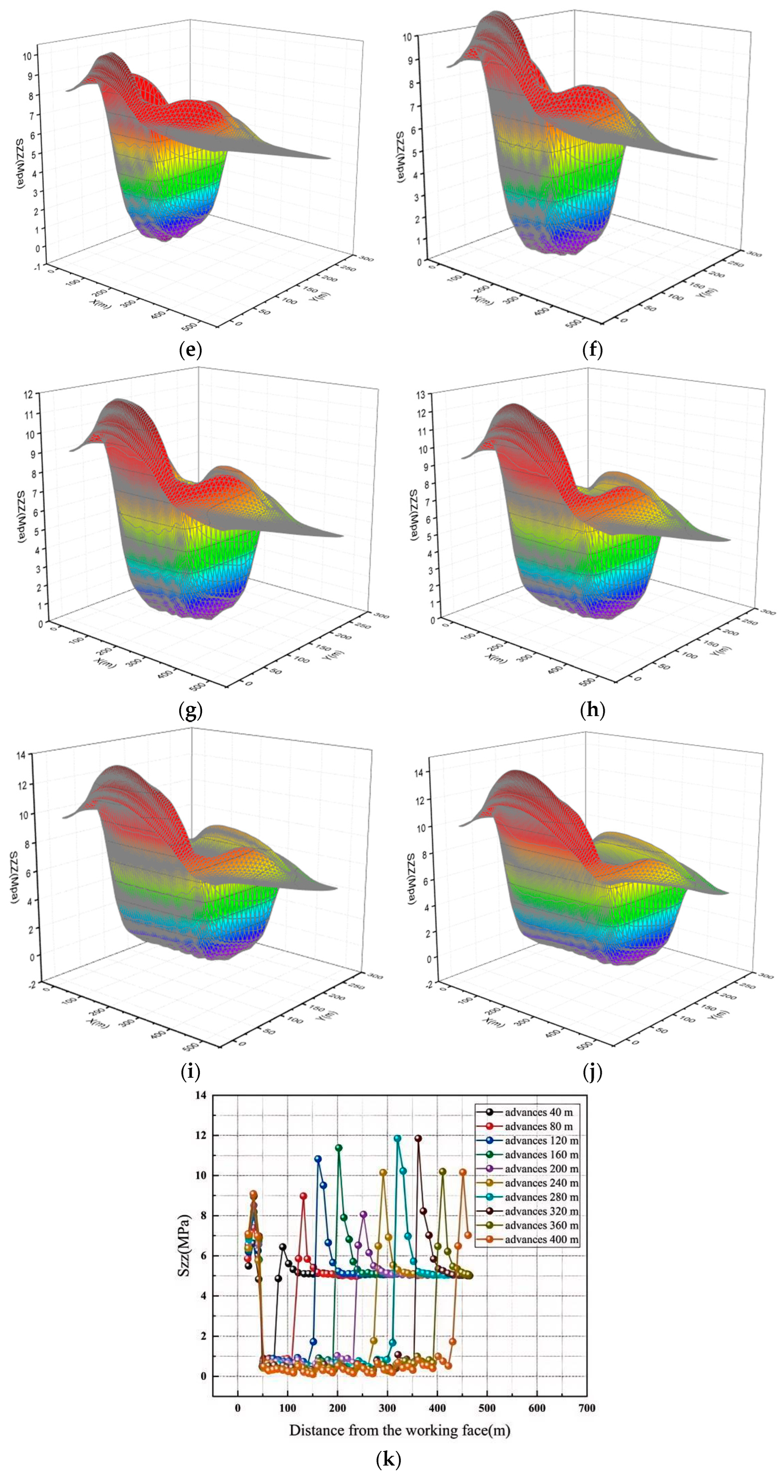 As can be seen from the three-dimensional surface (Figure 7a–j), as the working face advances, the mining-induced stress field exhibits a typical “pressure arch” morphology, with the scale and scope of the arch continuously expanding. Stress concentration mainly occurs in the coal wall ahead of the working face (advance support pressure) and in the coal pillars on both sides of the goaf (lateral support pressure). The vertical stress variation curve at the central position of the goaf is shown in Figure 7k. As the working face advances, the vertical stress first increases and then decreases. The main reason is that the load is transferred to the coal wall in front of the working face and the coal pillars on both sides of the goaf. When the exposed span exceeds the ultimate strength of the rock stratum, the immediate roof begins to fracture and collapse, and the goaf is filled with collapsed rocks. The supporting capacity of these rubbles is much lower than that of intact coal walls and cannot withstand high stress. Therefore, the stress in this area will drop sharply, forming a “stress reduction zone” or “pressure relief zone” with lower stress than the original rock stress.
