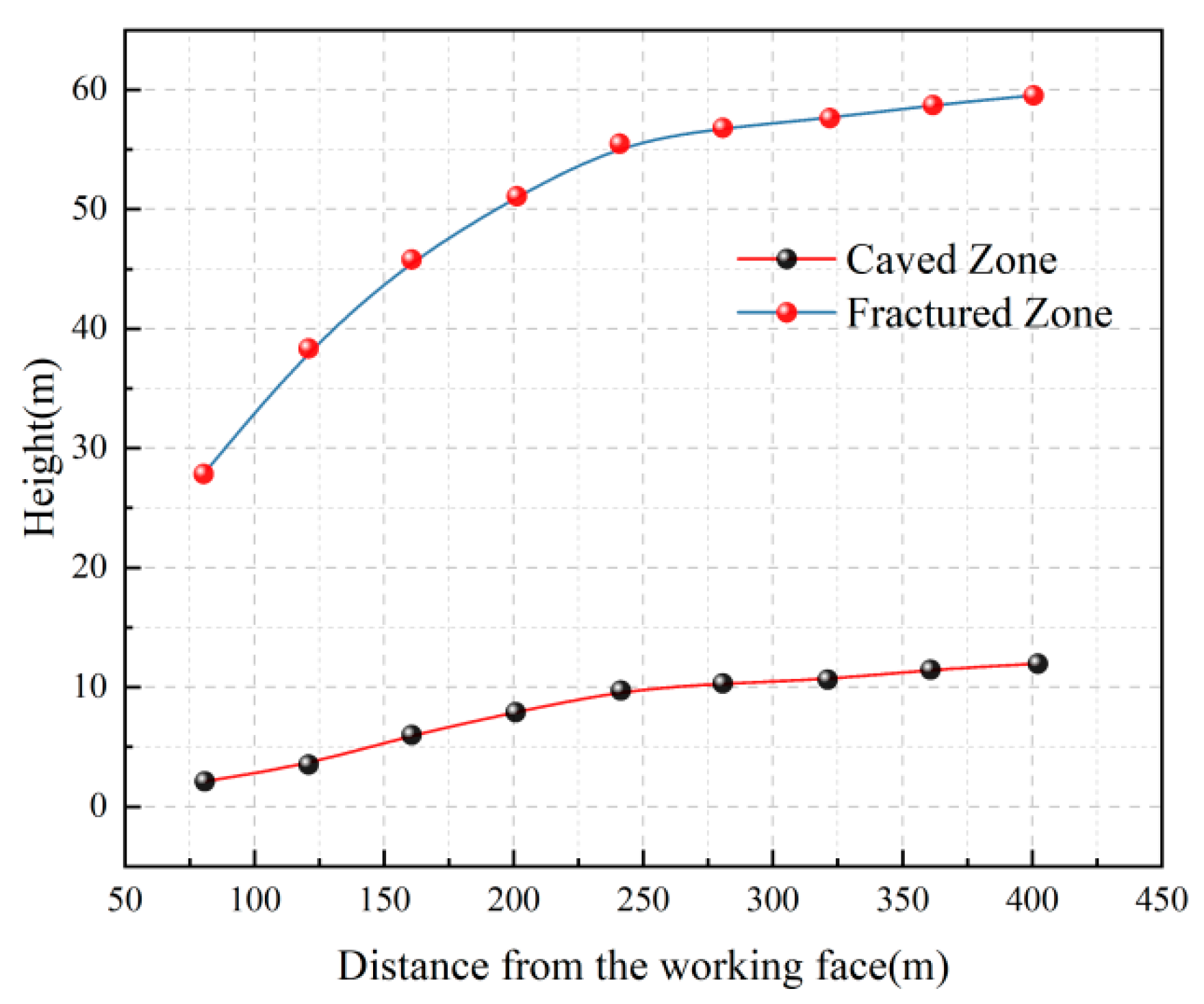 The relationship curve between the development height of the collapse zone and fracture zone in the direction of the strike and the distance of the working face advancement is shown in Figure 8.