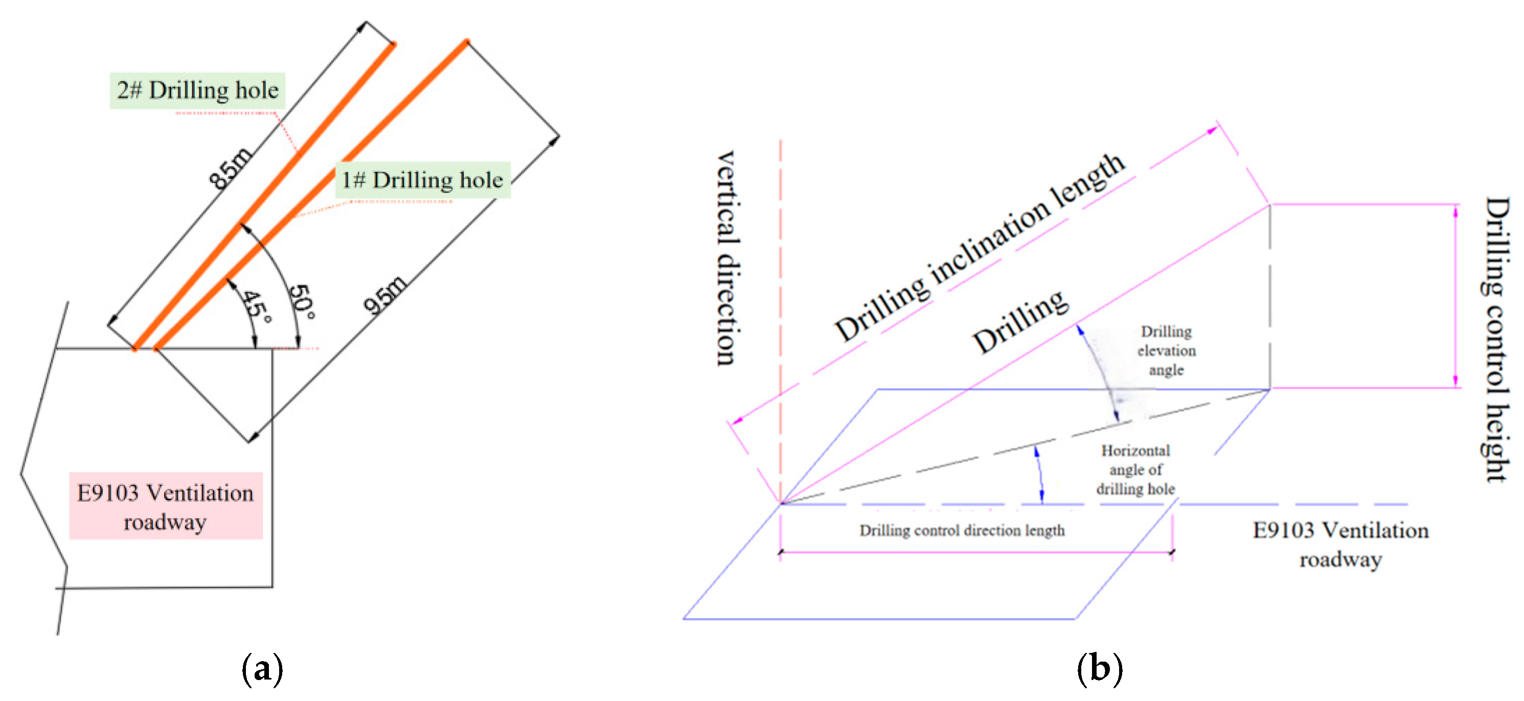 Figure 12. Drill Hole Specifications. (a) Drilling plan. (b) Exploration Drill Site Plan. (The orange-yellow line indicates the drilling depth; The pink line represents the actual position of the drill hole, while the black line represents its projection).