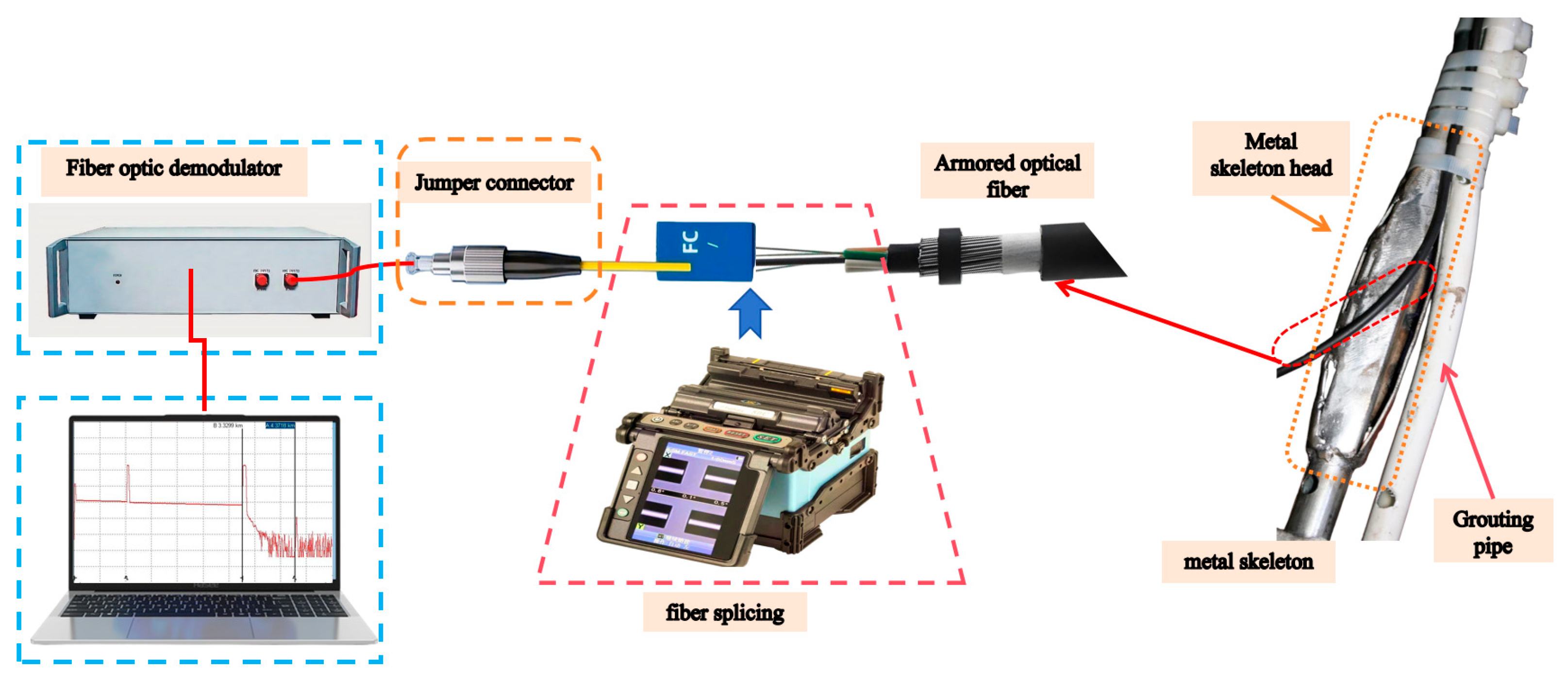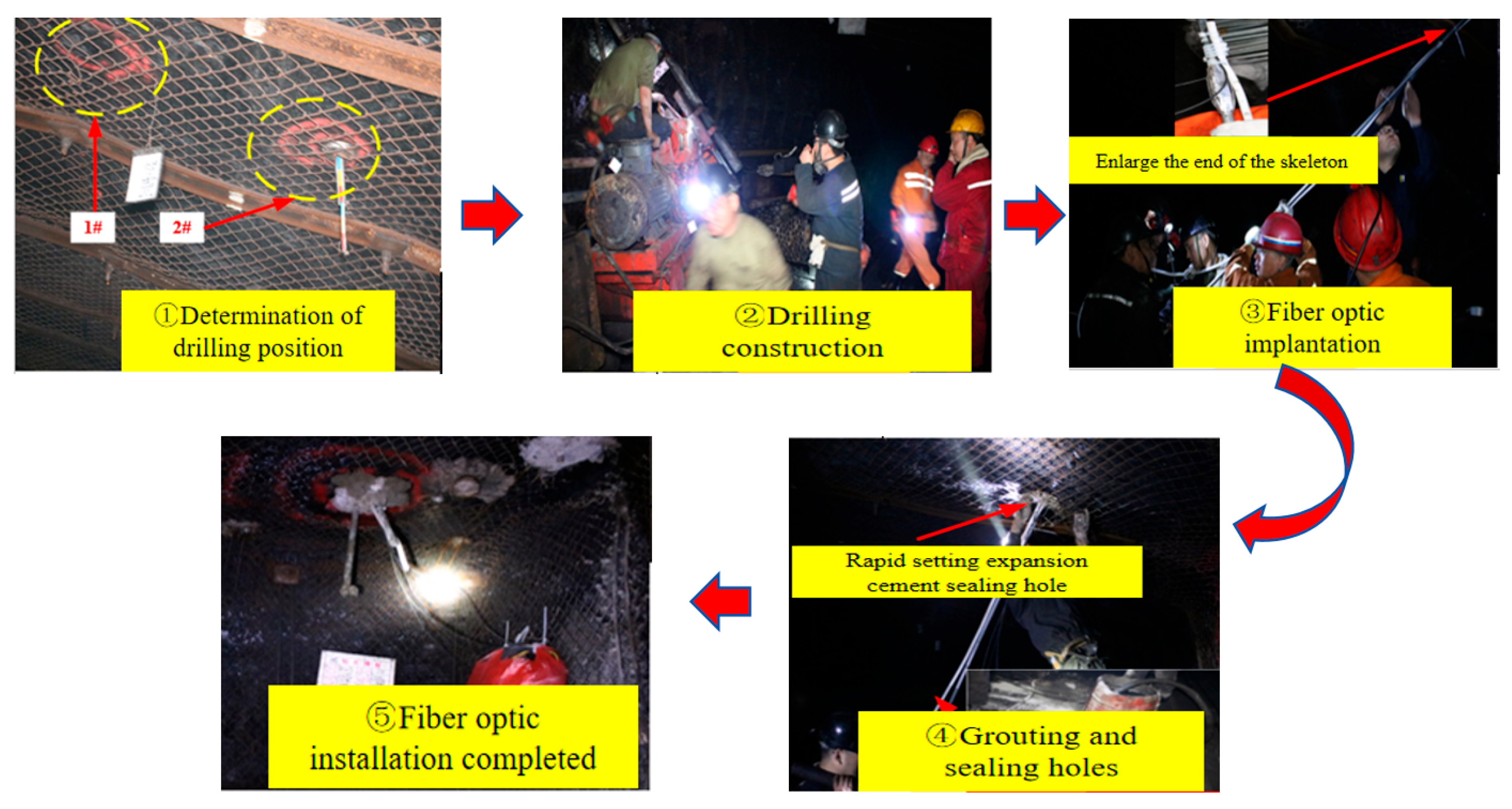 Fixed clamps are mounted at intervals along the rib of the roadway. The fiber optic cable is securely fastened within the clamps to prevent contact damage from personnel or equipment. Borehole-embedded installation is used for internal monitoring within the rock strata. The specific installation steps are as follows: