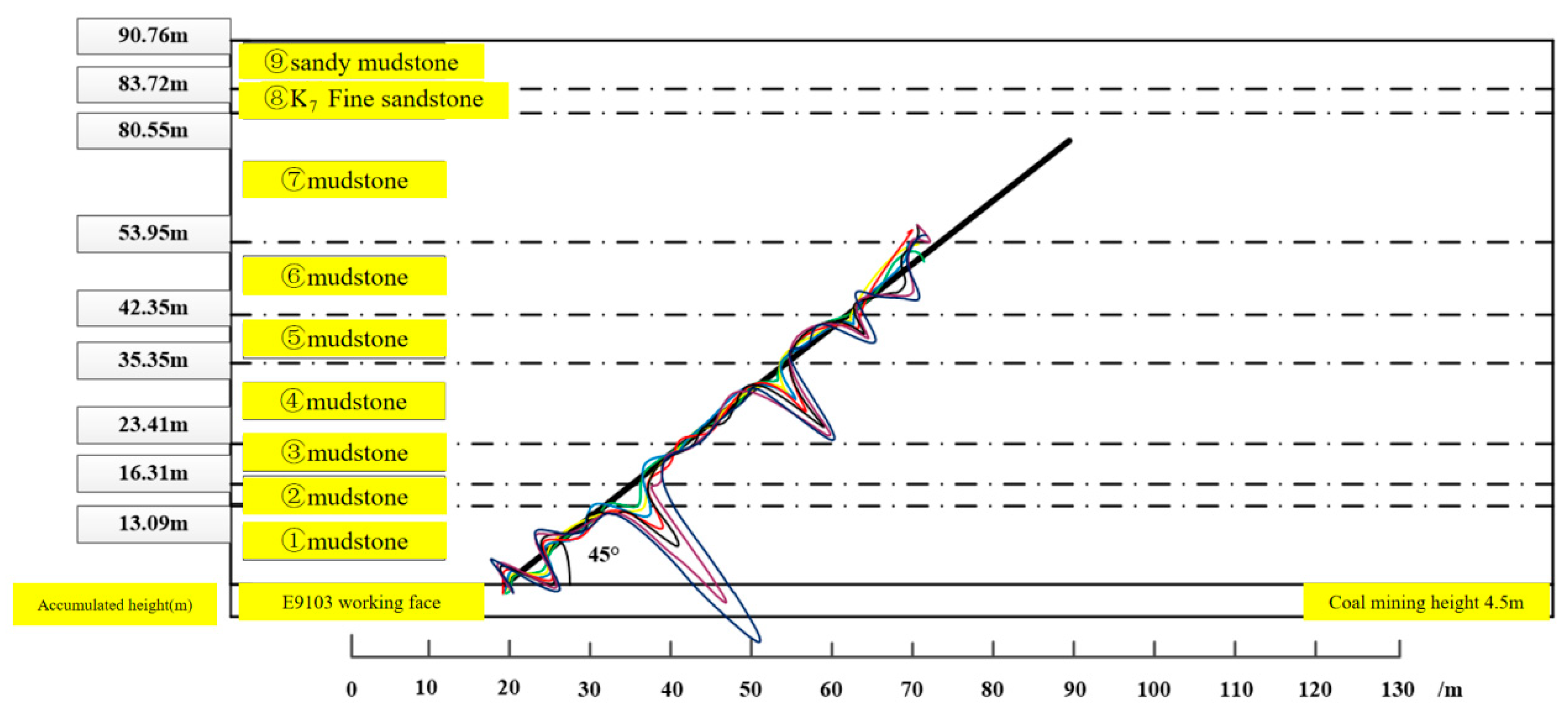 Figure 18 presents the strain variation curves of the sensing fiber at depths of 17.1 m, 46.5 m, and 60 m in Borehole 2# as the working face advanced. The monitoring point at 17.1 m depth is situated near the interface between ① K2 limestone and ② coal/mudstone, with a vertical height of 13.5 m above the roof of the fully mechanized top-coal caving face E9103. As the working face approached, the compressive strain of the optical fiber increased significantly and eventually led to fiber damage due to strata failure, reaching a maximum compressive strain of approximately –2600 με. At this stage, the horizontal distance from the working face to the monitoring point was about 45 m (positive values indicate positions ahead of the face, negative values behind it).