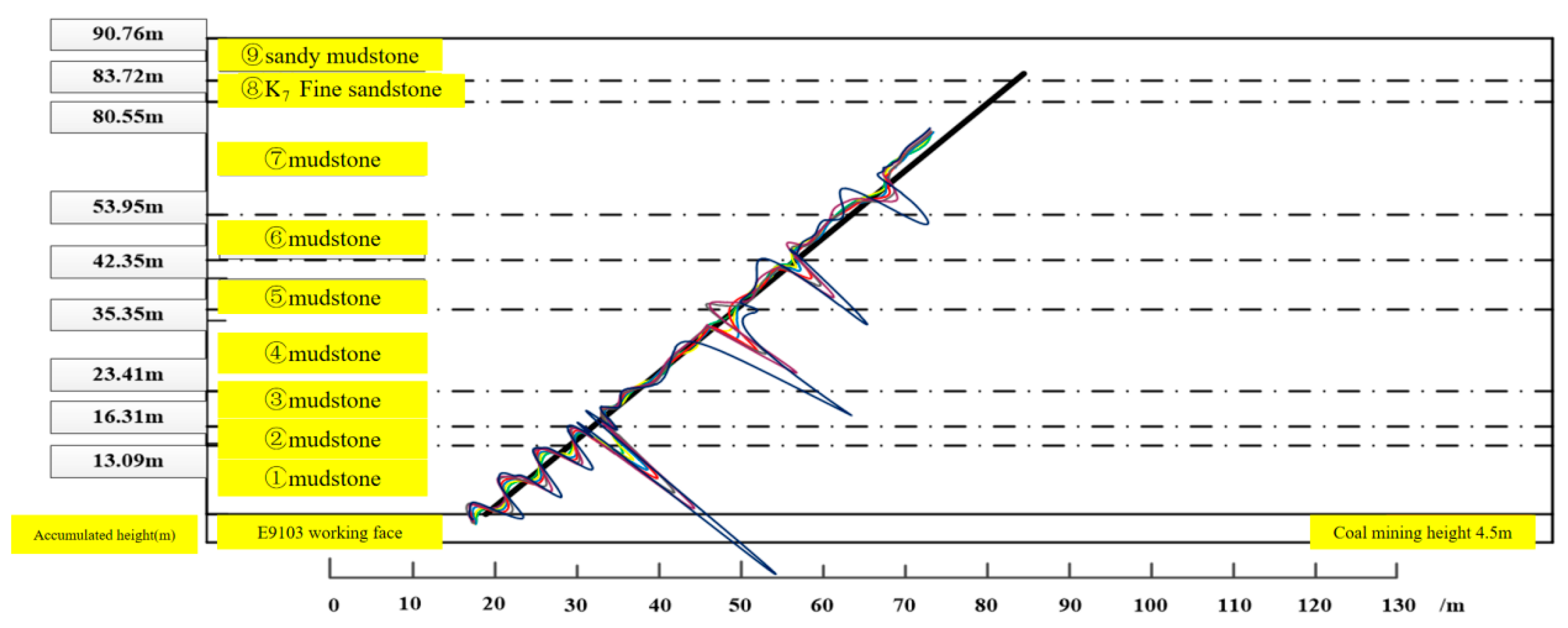 One of the most direct approaches for studying the overlying strata behavior during the retreat of working face E9103 is in situ monitoring. This study was conducted at the E9103 working face of a coal mine in Shanxi province, China, focusing on the movement and failure patterns of the overburden after mining, as well as the spatio-temporal evolution of the overlying strata before and after extraction. The objective was to determine the heights of the fractured zone and the water-conducting fracture zone resulting from the extraction of the 9 + 10 coal seam at Hengjin coal mine.