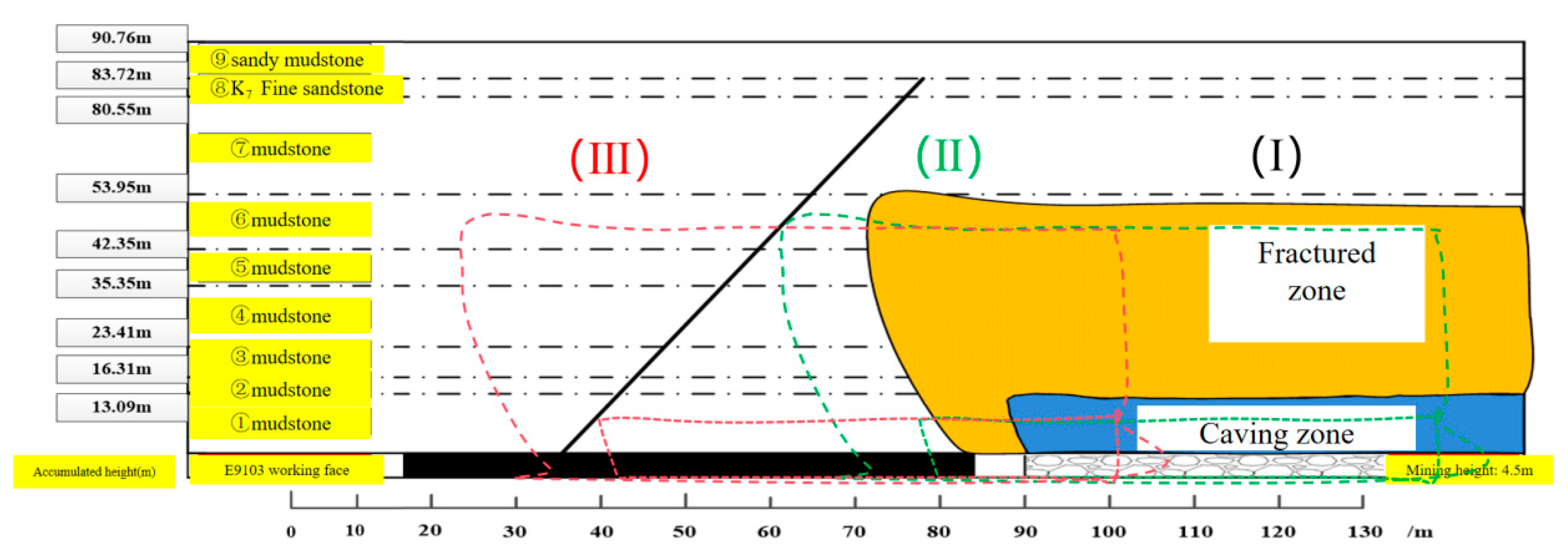 During fully mechanized top-coal caving mining, the advance of the working face induces stress redistribution in the overlying strata, leading to their deformation, damage, and failure. This process forms the caved zone, fractured zone, and bent zone—collectively termed the “three zones”. Accurately determining the spatio-temporal development and heights of these zones is paramount for preventing water inrushes, especially in mines operating above confined aquifers or under complex hydrogeological conditions. The risk escalates significantly during pressurized mining near such aquifers [1,2,3]. Accurately determining the spatio-temporal evolution and extent of the overburden “three zones” is critical for mitigating roof water inrush risks in longwall mining, particularly when operating above confined aquifers or under complex hydrogeological settings. Under such challenging conditions—such as mining in close proximity to high-pressure aquifers—the potential for water inrush rises substantially [4]. Since the 1960s, significant research efforts have been devoted to understanding mining-induced failure mechanisms in coal seam floors, resulting in notable theoretical and practical progress [5]. Foundational contributions include the development of the water inrush coefficient model, hydro-mechanical coupling criteria, structural models of the “lower three zones” and “lower four zones,” along with key stratum theory and elastic thin plate theory. Together, these advances have established an essential basis for forecasting and preventing floor water inrush incidents [6,7,8].
