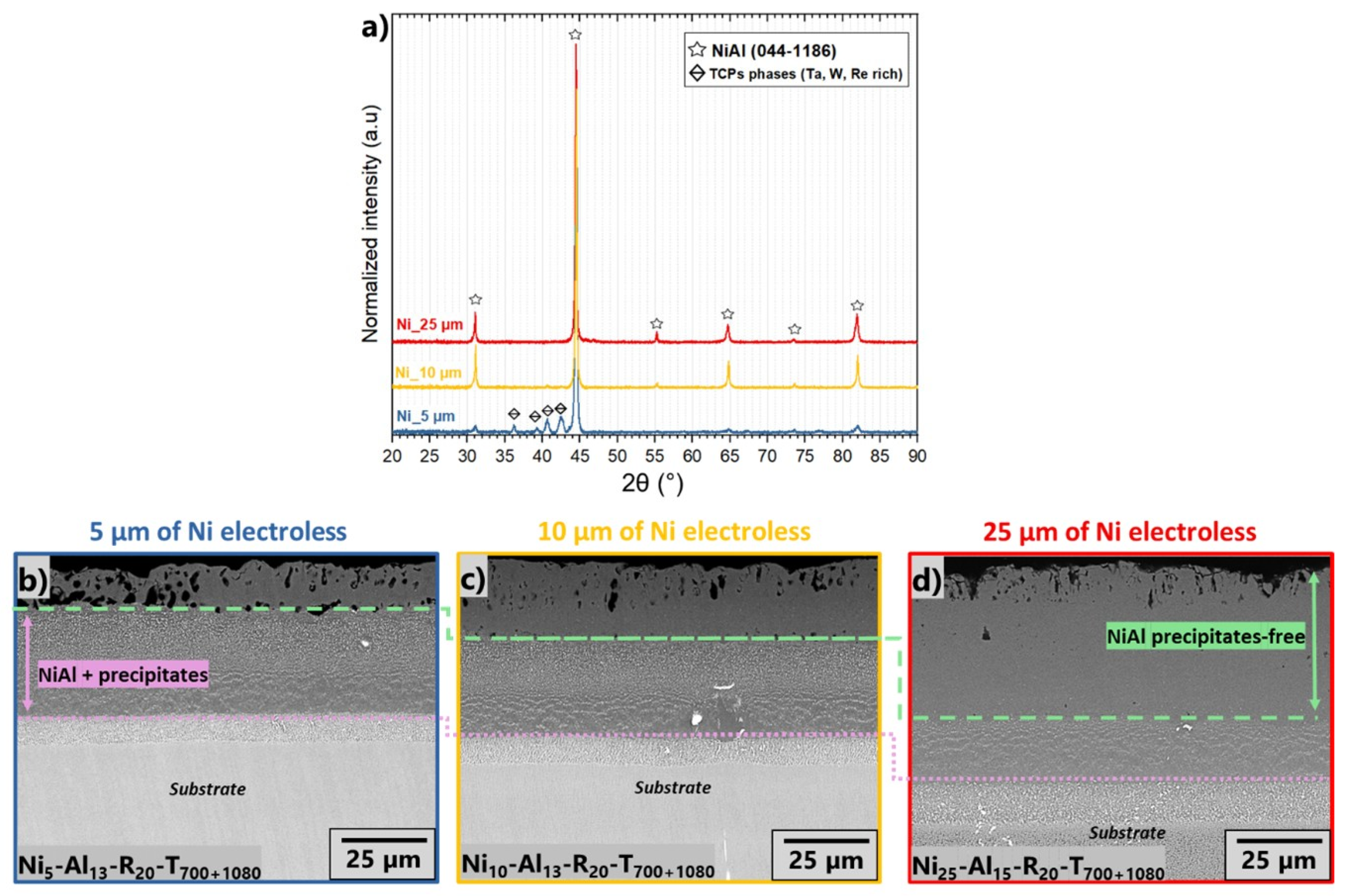 - Genova, V.; Pedrizzetti, G.; Paglia, L.; Marra, F.; Bartuli, C.; Pulci, G. Diffusion aluminide coating modified via electroless nickel plating for Ni-based superalloy protection. Surf. Coat. Technol. 2022, 439, 128452. [Google Scholar] [CrossRef]