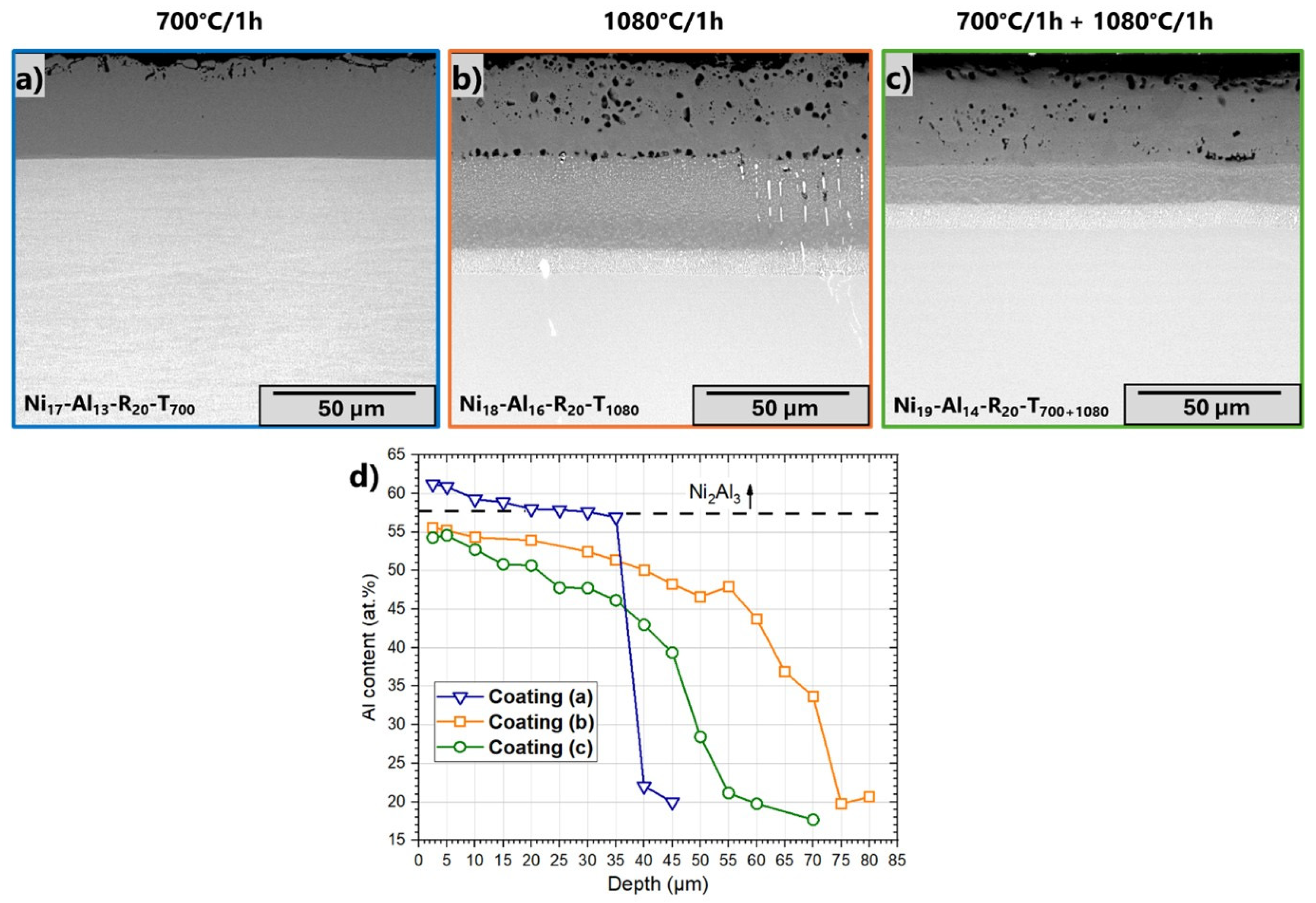 - Bermejo Sanz, J.; Roussel García, R.; Kolarik, V.; Juez Lorenzo, M.M. Influence of the slurry thickness and heat treatment parameters on the formation of aluminium diffusion coating. Oxid. Met. 2017, 88, 179–190. [Google Scholar] [CrossRef]