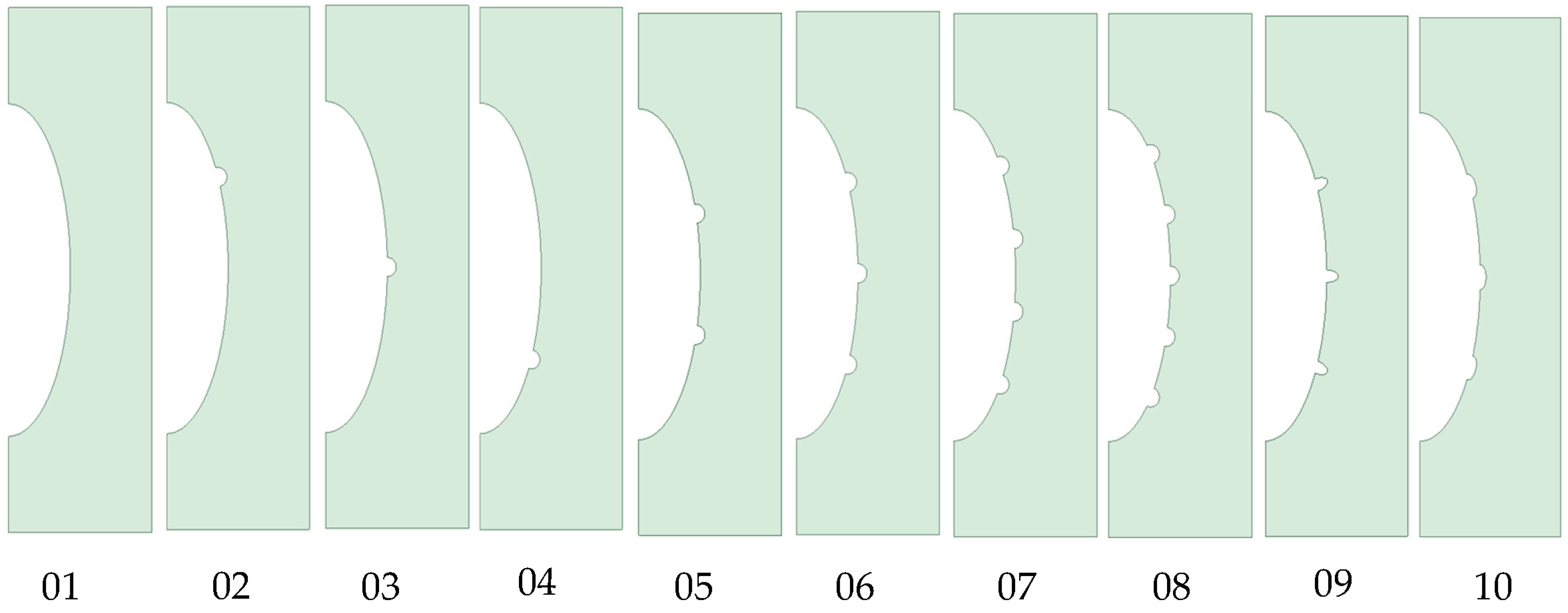 - The heat transfer performance of enhanced elliptical tubes is strongly dependent on the number of protrusions on the tube exterior. As the number of protrusions increases, the heat transfer performance exhibits a non-monotonic trend, first increasing and then decreasing. For an ellipticity of e = 1, Model 07 exhibits the highest heat transfer performance.