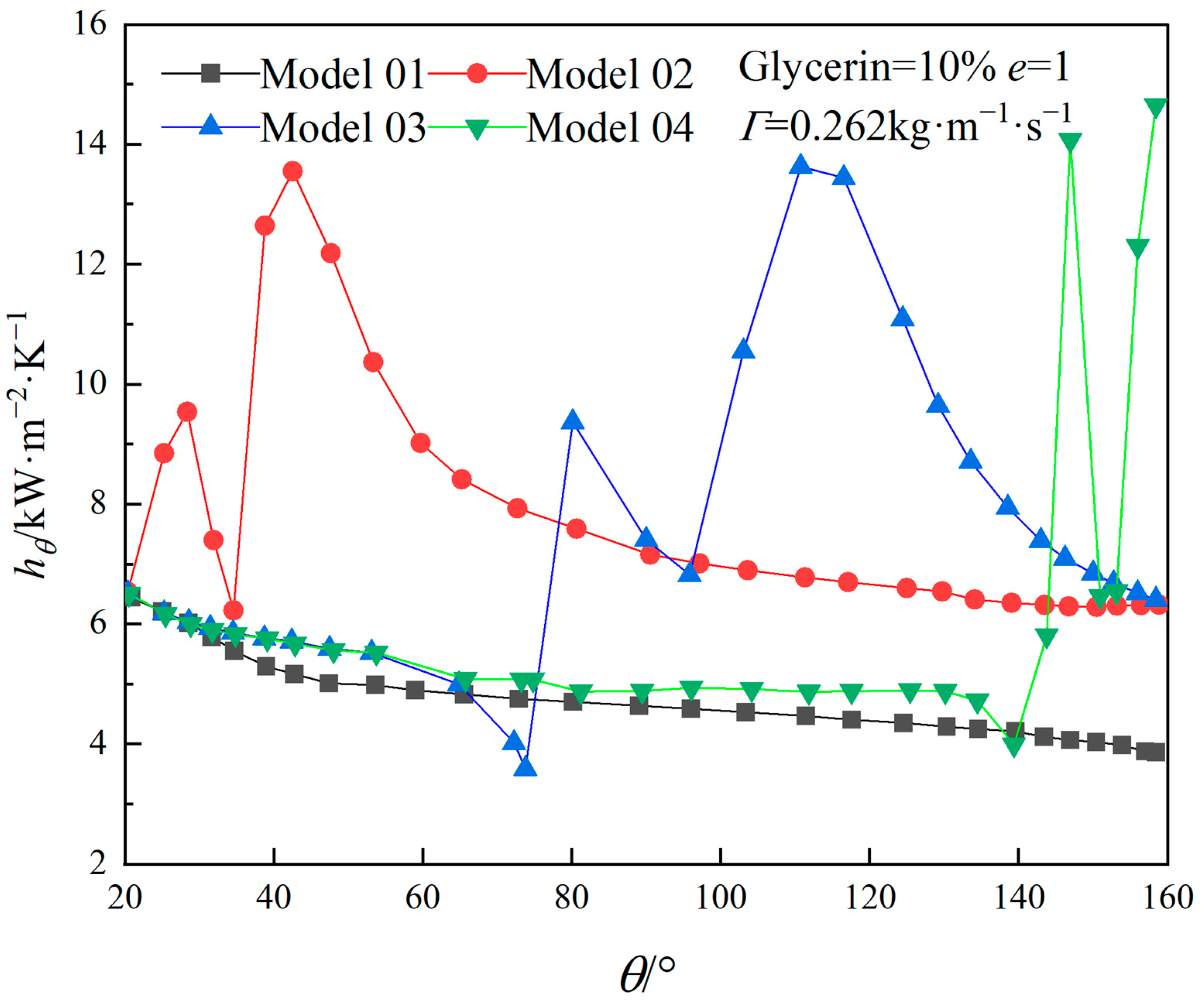 - In the optimized design of the elliptical tube, the location of the protrusion outside the tube should be taken into account, so that when intervening in the liquid film flow outside the tube at an early stage, the disturbance effect of the protrusion on the liquid film flow can be used to accelerate turbulent mixing inside the liquid film and reduce the thermal resistance; this approach thereby more rapidly and effectively enhances the convective heat transfer intensity on the outer surface of the tube and improves the overall heat transfer performance at an early stage.