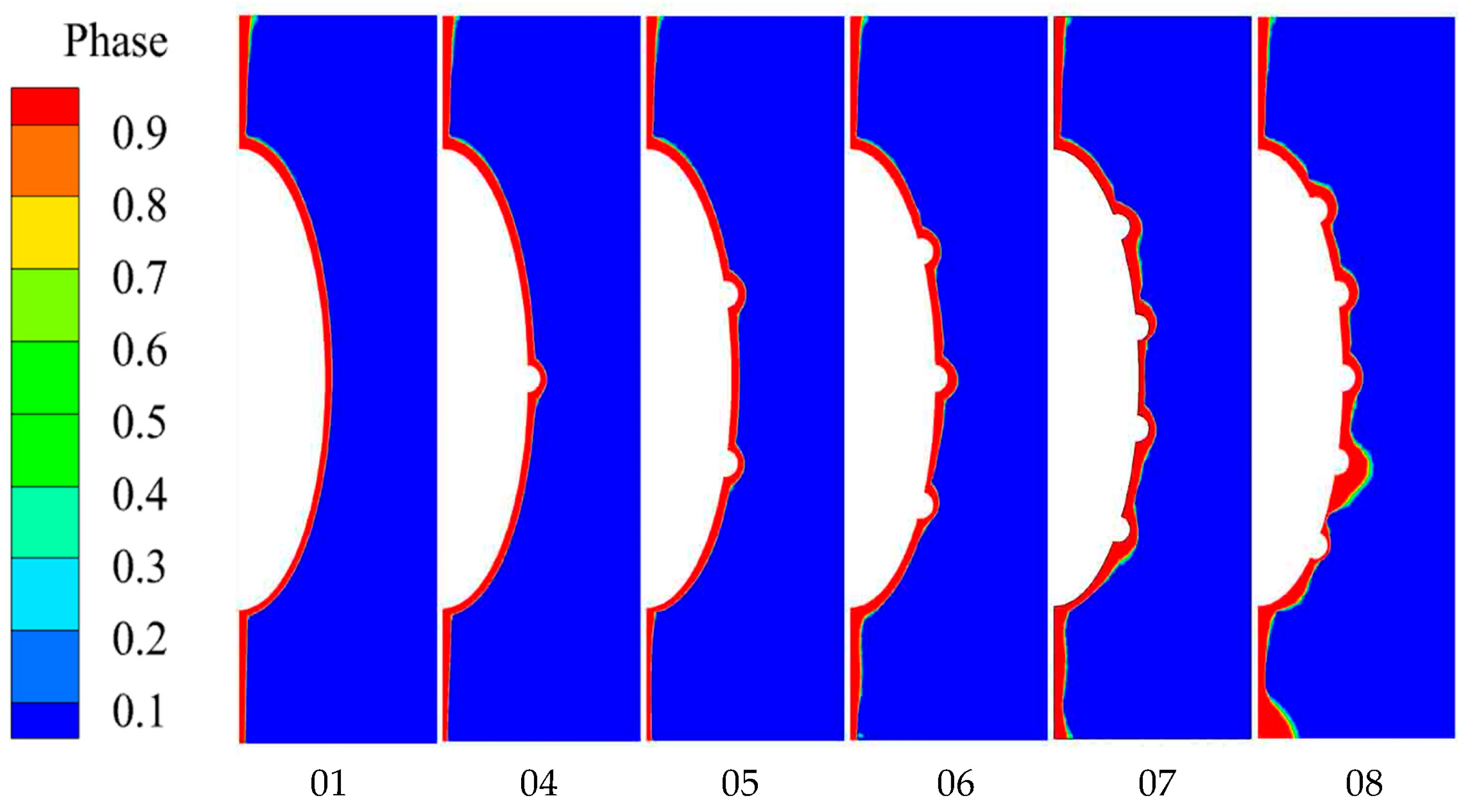 4.1. Spatiotemporal Evolution of Falling Films over Enhanced Elliptical Tubes