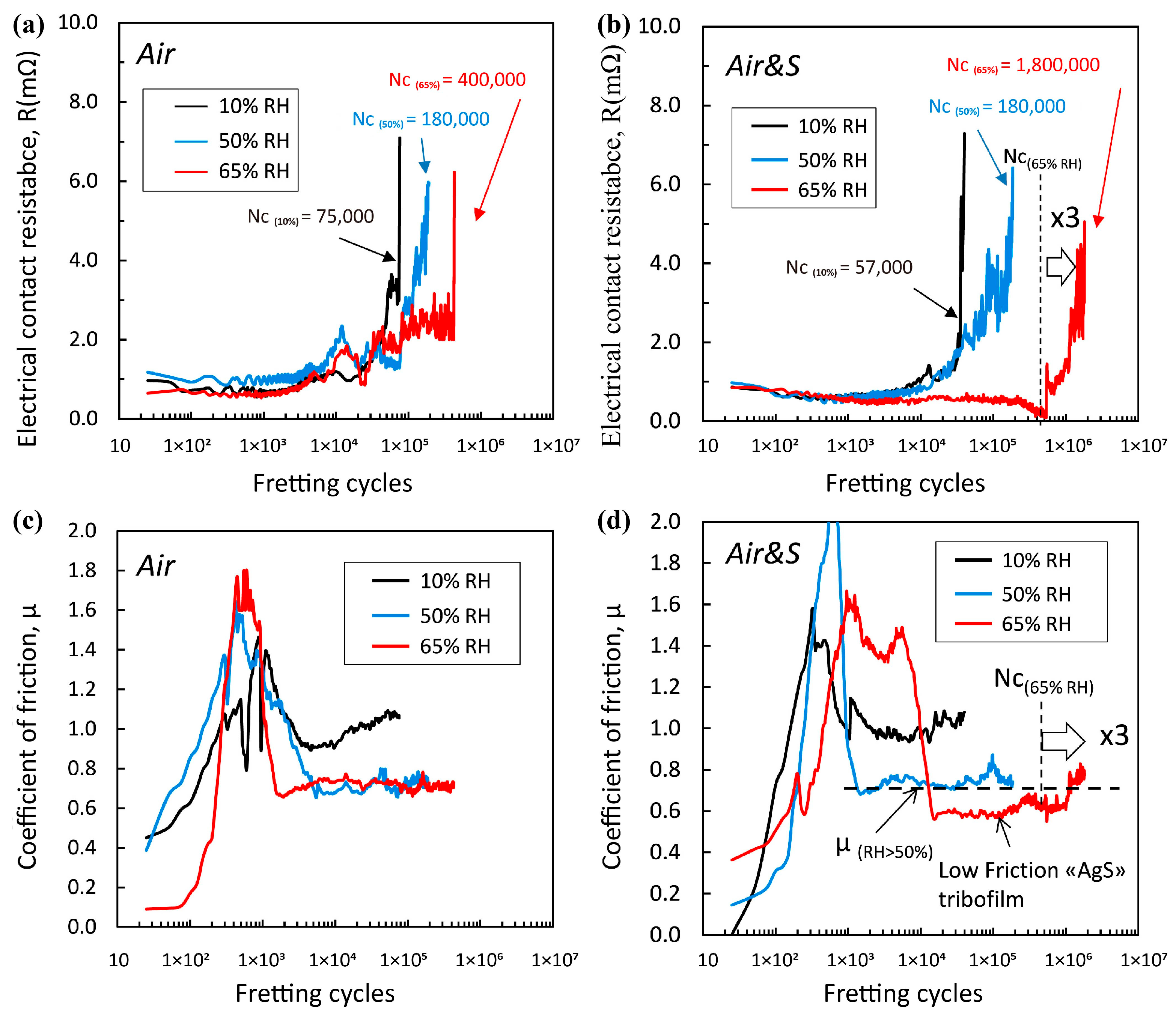 | High humidity (>70% RH) | [72] | C/Cu | Strong (↓) | Moderate (↑) | Strong (unstable) | Electrochemical–mechanical coupling (tribocorrosion) |