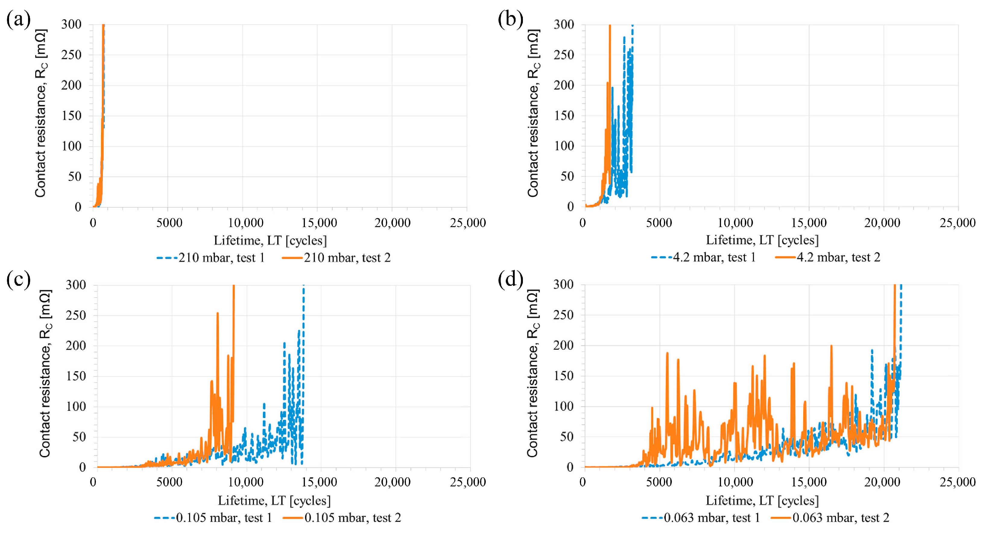 - Jedrzejczyk, P.; Fouvry, S.; Chalandon, P. A Fast Methodology to Quantify Electrical-Contact Behaviour under Fretting Loading Conditions. Wear 2009, 267, 1731–1740. [Google Scholar] [CrossRef]