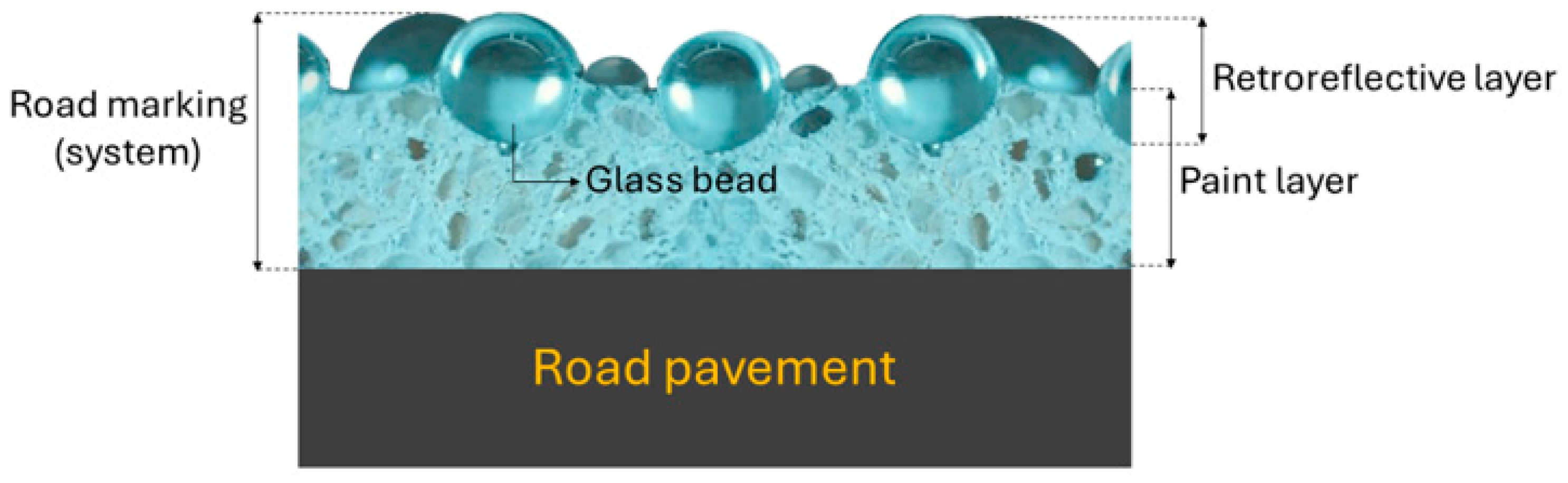 - Burghardt, T.E.; Pashkevich, A.; Babić, D.; Mosböck, H.; Babić, D.; Żakowska, L. Microplastics and Road Markings: The Role of Glass Beads and Loss Estimation. Transp. Res. D Transp. Environ. 2022, 102, 103123. [Google Scholar] [CrossRef]