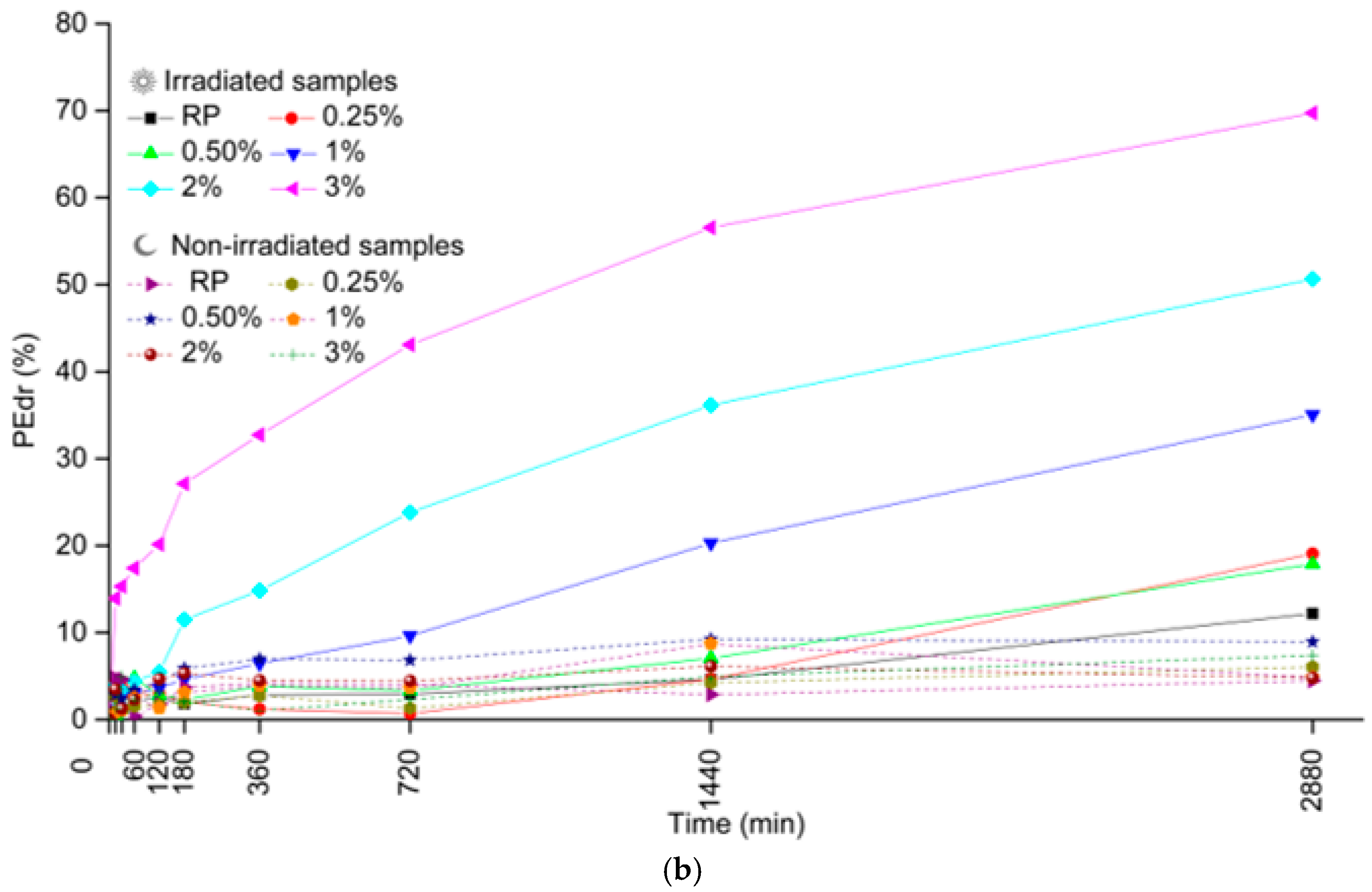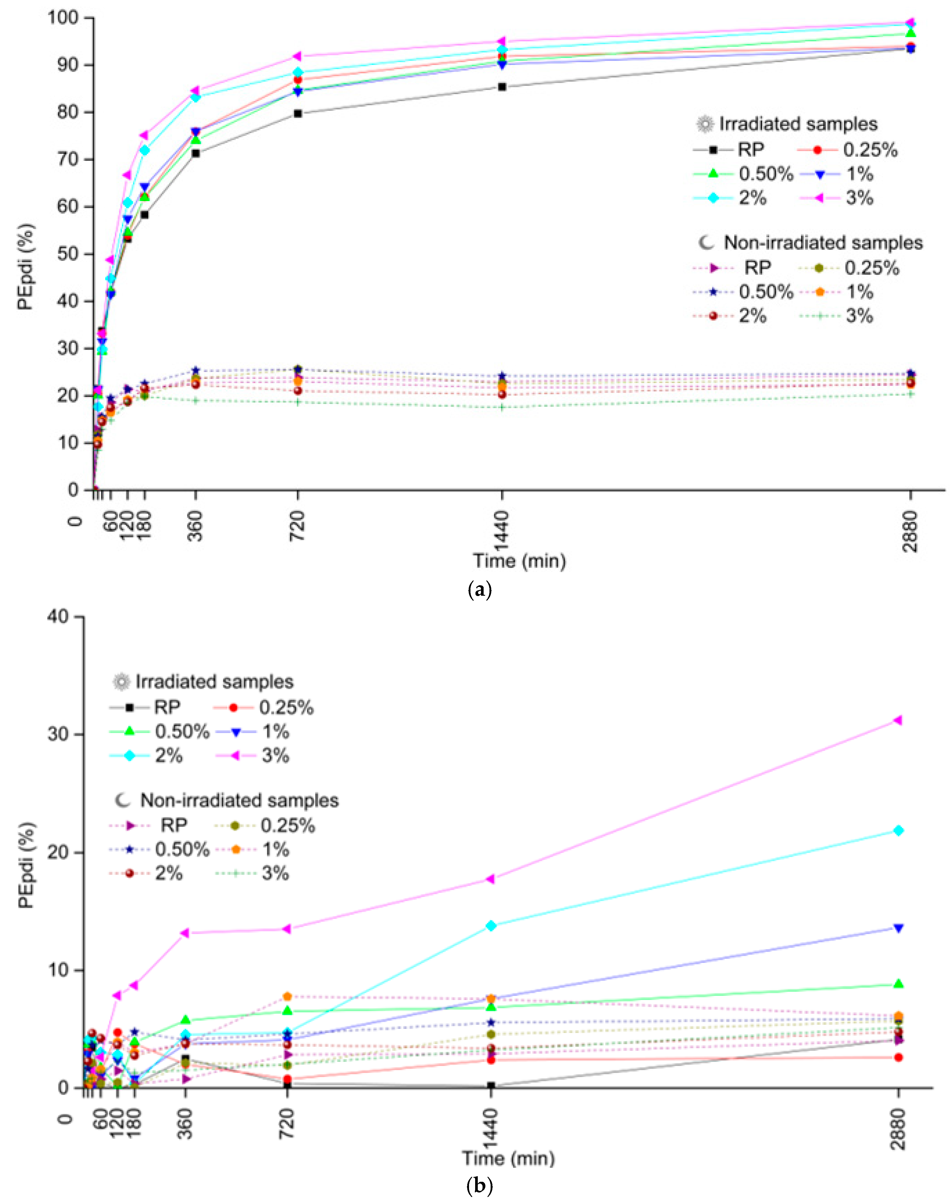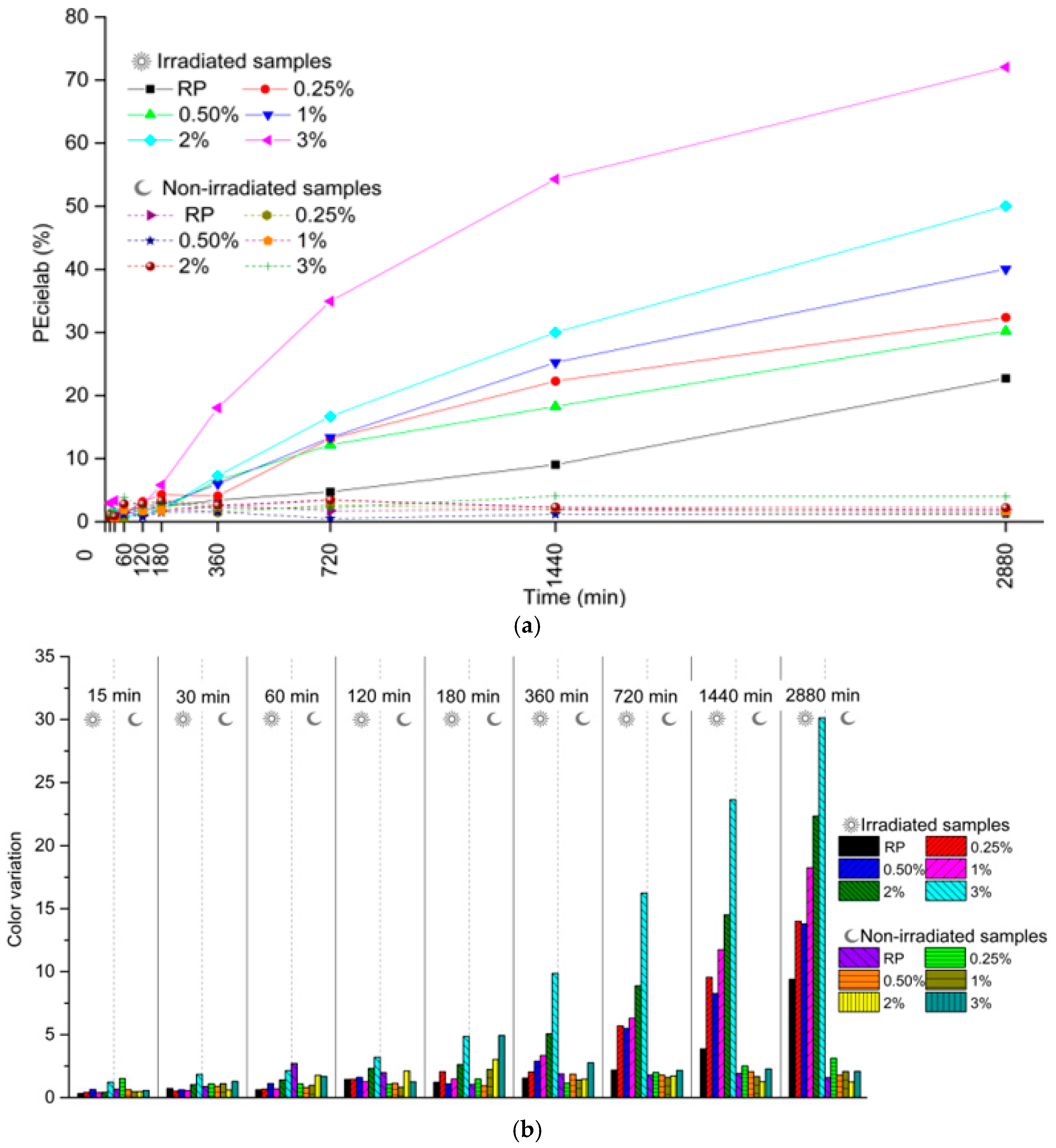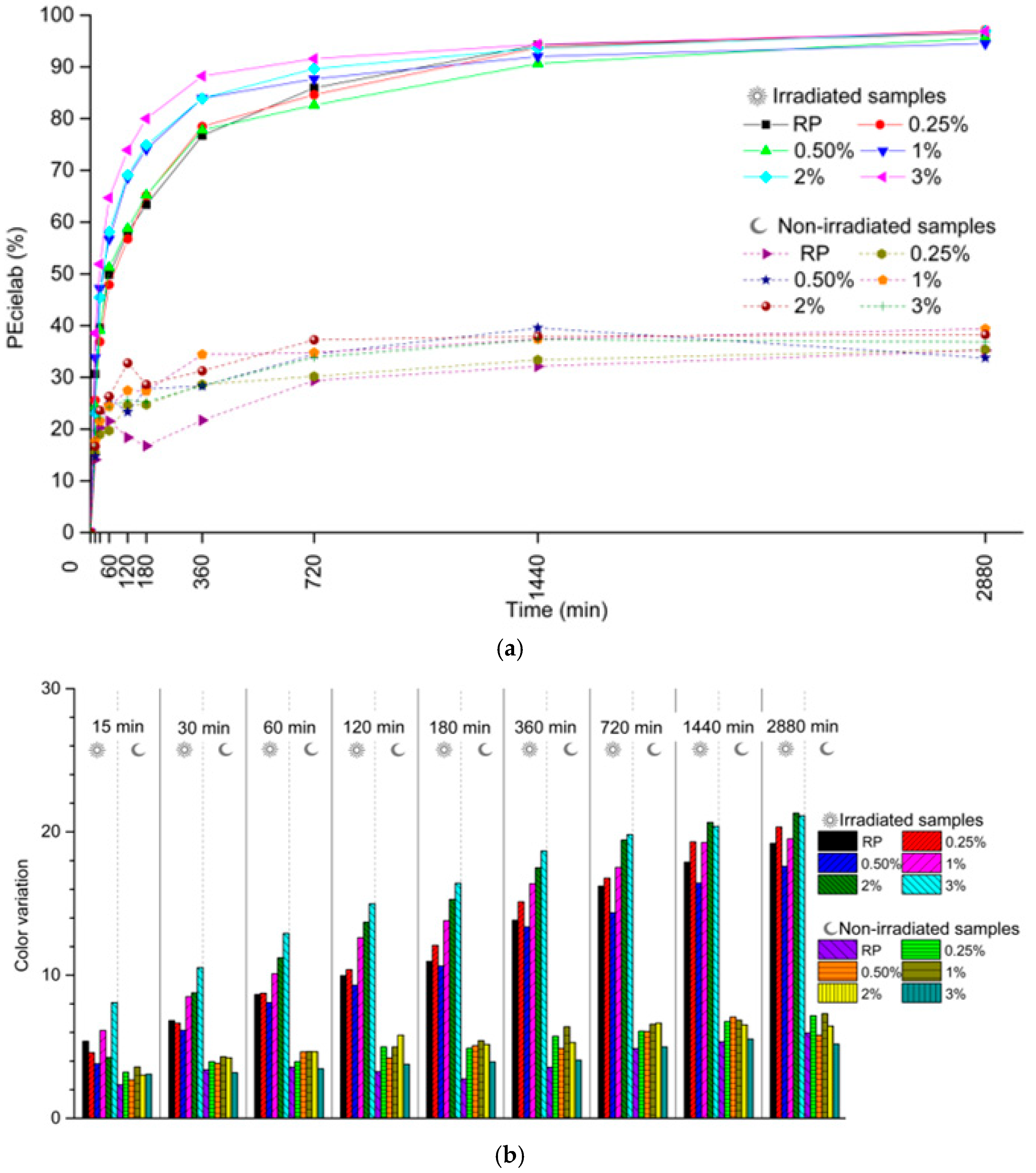 - CIELAB color space revealed that the samples 2% and 3% exhibited higher color variation and photocatalytic efficiency, regardless of pollutant model.