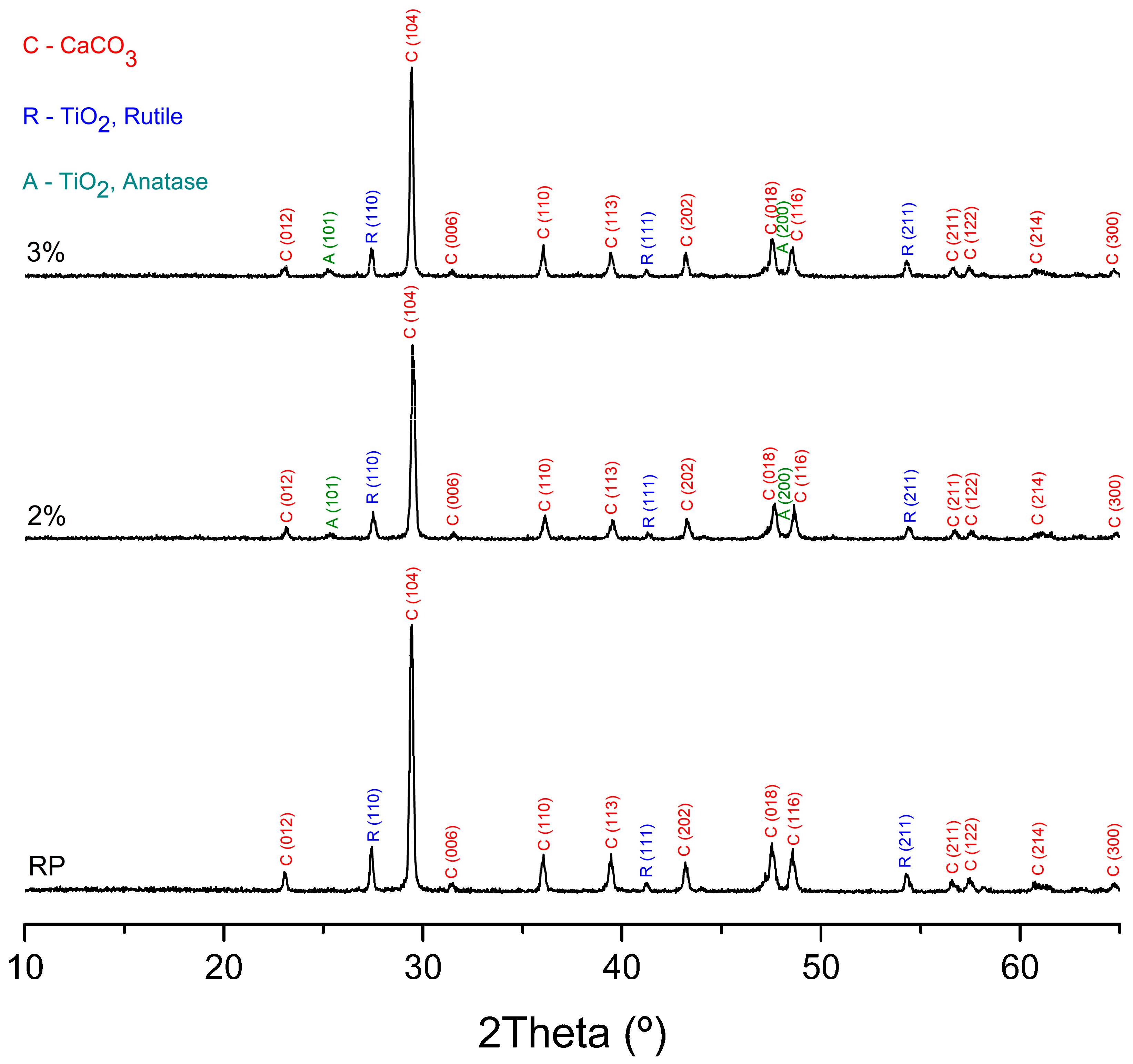 | CaCO3 | TiO2, Anatase | TiO2, Rutile | |