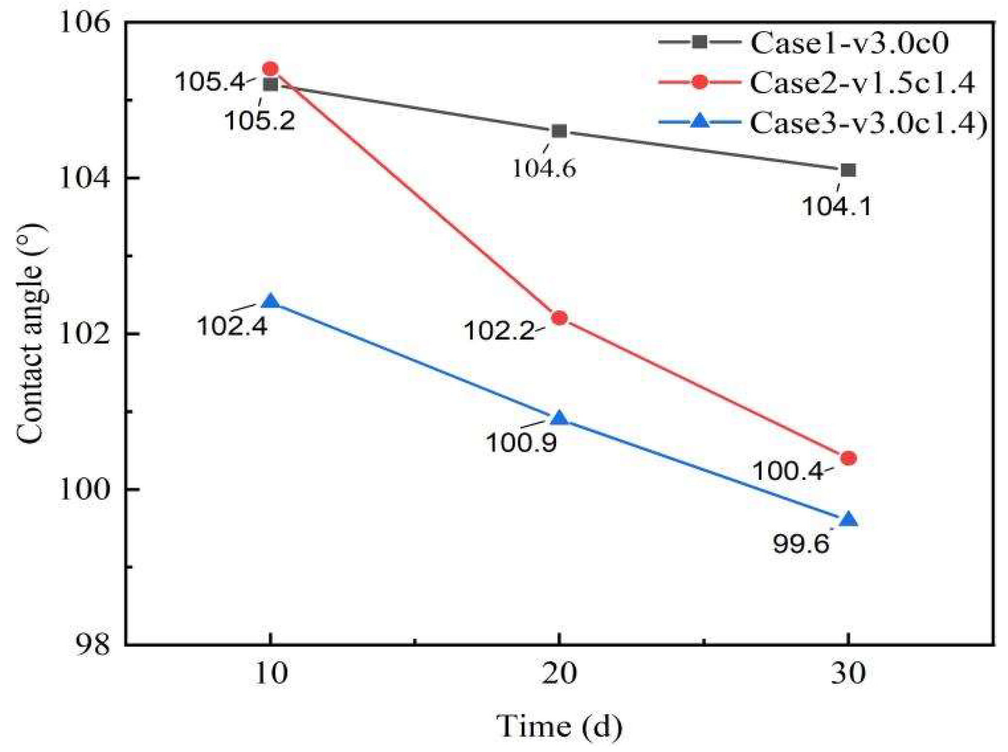 - Experimental results revealed distinct hydrophobicity variations under different erosion conditions. Seawater flushing alone caused only a 1.1° reduction in contact angle, whereas seawater containing sediment induced significantly larger decreases of 4.9–5.2°. At identical flow velocities, sediment-free conditions maintained superior hydrophobic performance, exhibiting both a more gradual decline in contact angle and enhanced stability during the initial immersion period compared with sediment erosion scenarios.