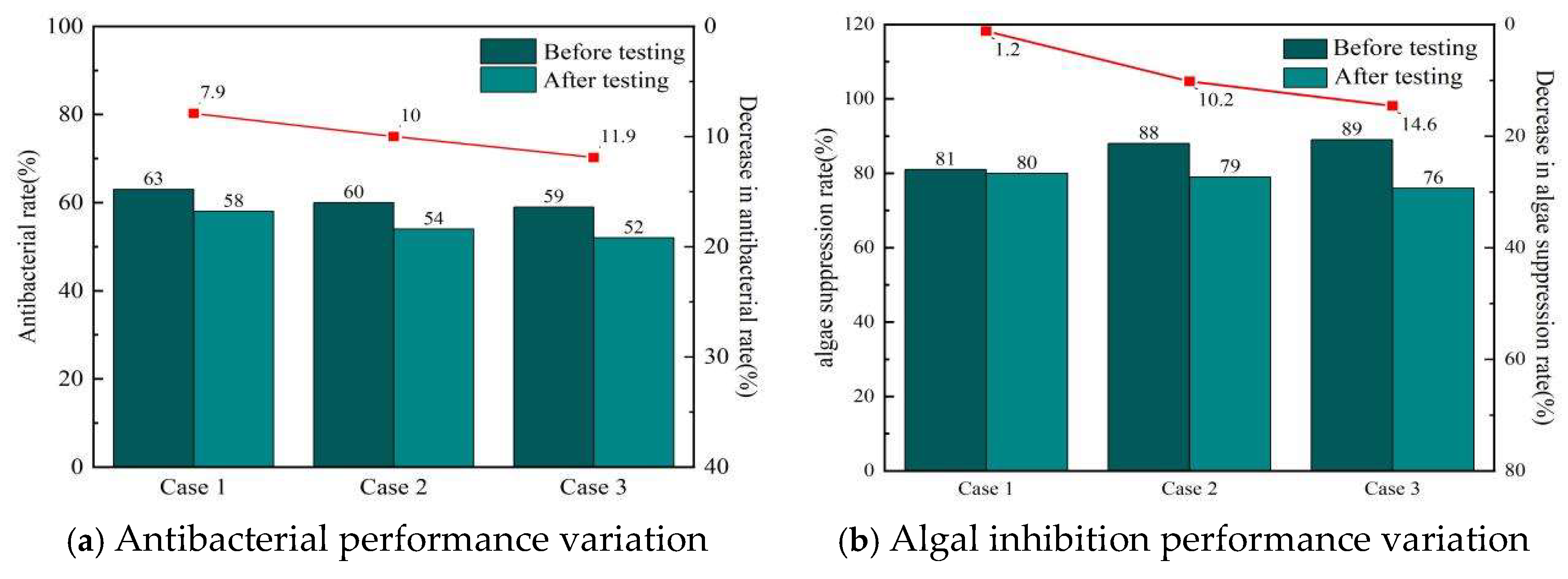 3.6. Variation in Coating Antibacterial and Algal-Inhibition Performance