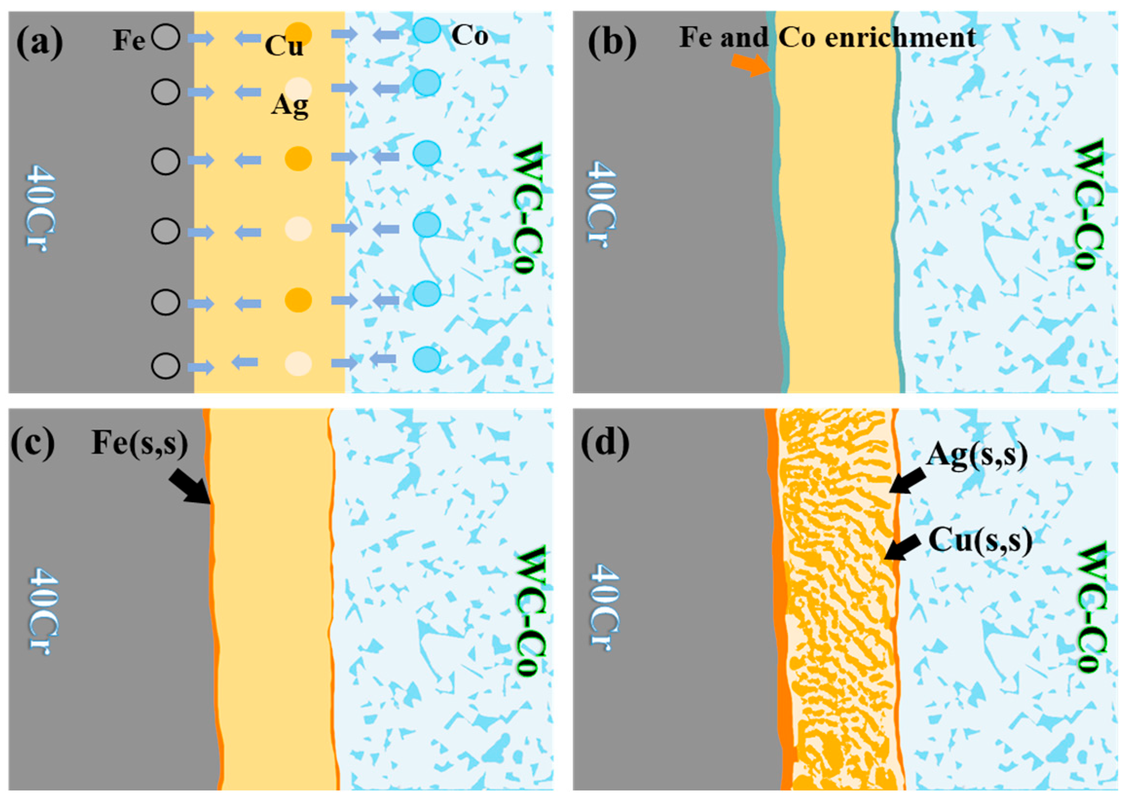 - Habibi, F.; Samadi, A.; Nouri, M. Microstructural evolution during low-temperature brazing of WC-Co cemented carbide to AISI 4140 steel using a silver-based filler alloy. Int. J. Refract. Met. Hard Mater. 2023, 116, 106354. [Google Scholar] [CrossRef]