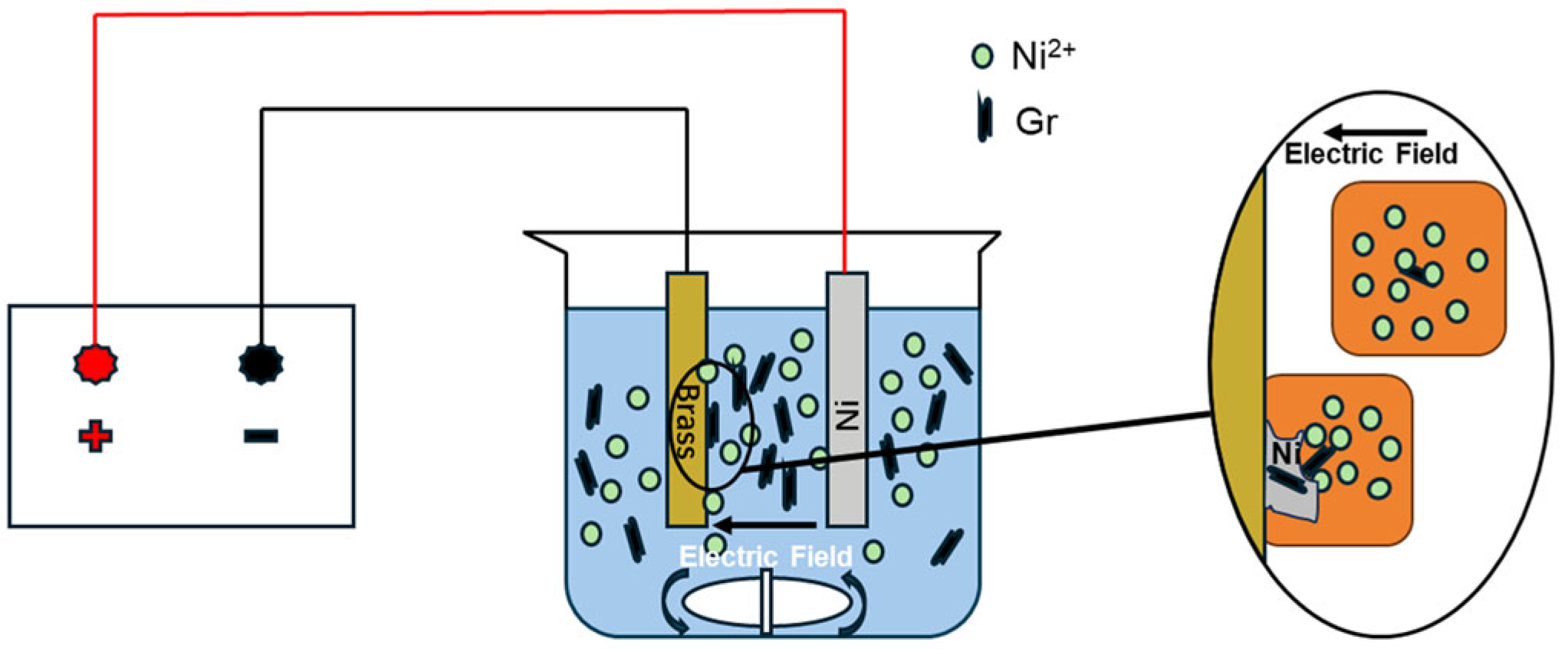- Pingale, A.D.; Belgamwar, S.U.; Rathore, J.S. Synthesis and characterization of Cu–Ni/Gr nanocomposite coatings by electro-co-deposition method: Effect of current density. Bull. Mater. Sci. 2020, 43, 66. [Google Scholar] [CrossRef]