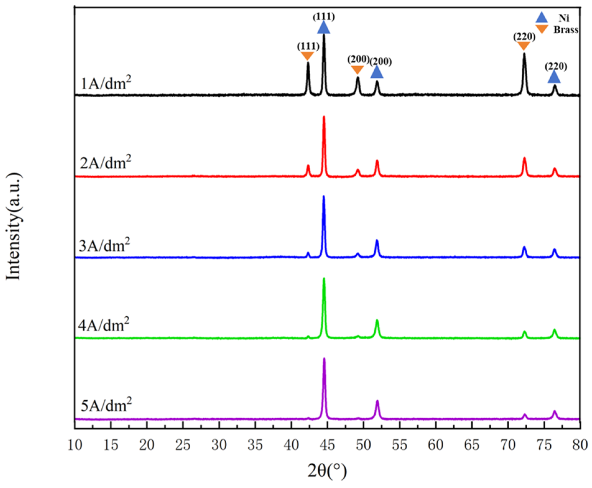 - Current density significantly regulates the microstructure of Ni–Gr coatings. At 2 A/dm2, nickel grains are fine and dense, and graphene nanoplatelet disperses uniformly in the nickel matrix, with the nickel phase exhibiting a face-centered cubic (fcc) structure with fine-grained preferred orientation. Deviation from this current density leads to nickel grain coarsening and graphene nanoplatelet dispersion deterioration.