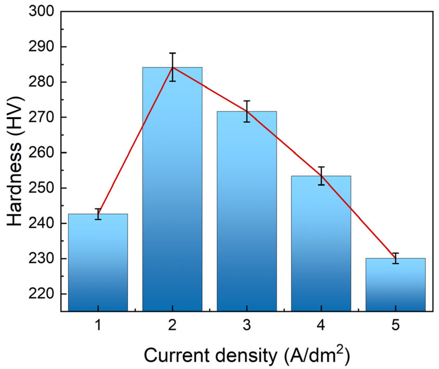 - Graphene nanoplatelets are co-deposited with nickel atoms, and their dispersion state and the resultant microstructure (grain size, compactness) dominate the coating’s performance. The fine-grained and dense structure at 2 A/dm2 facilitates the formation of efficient heat conduction channels and physical barriers, while also enhancing mechanical strength and wear resistance.