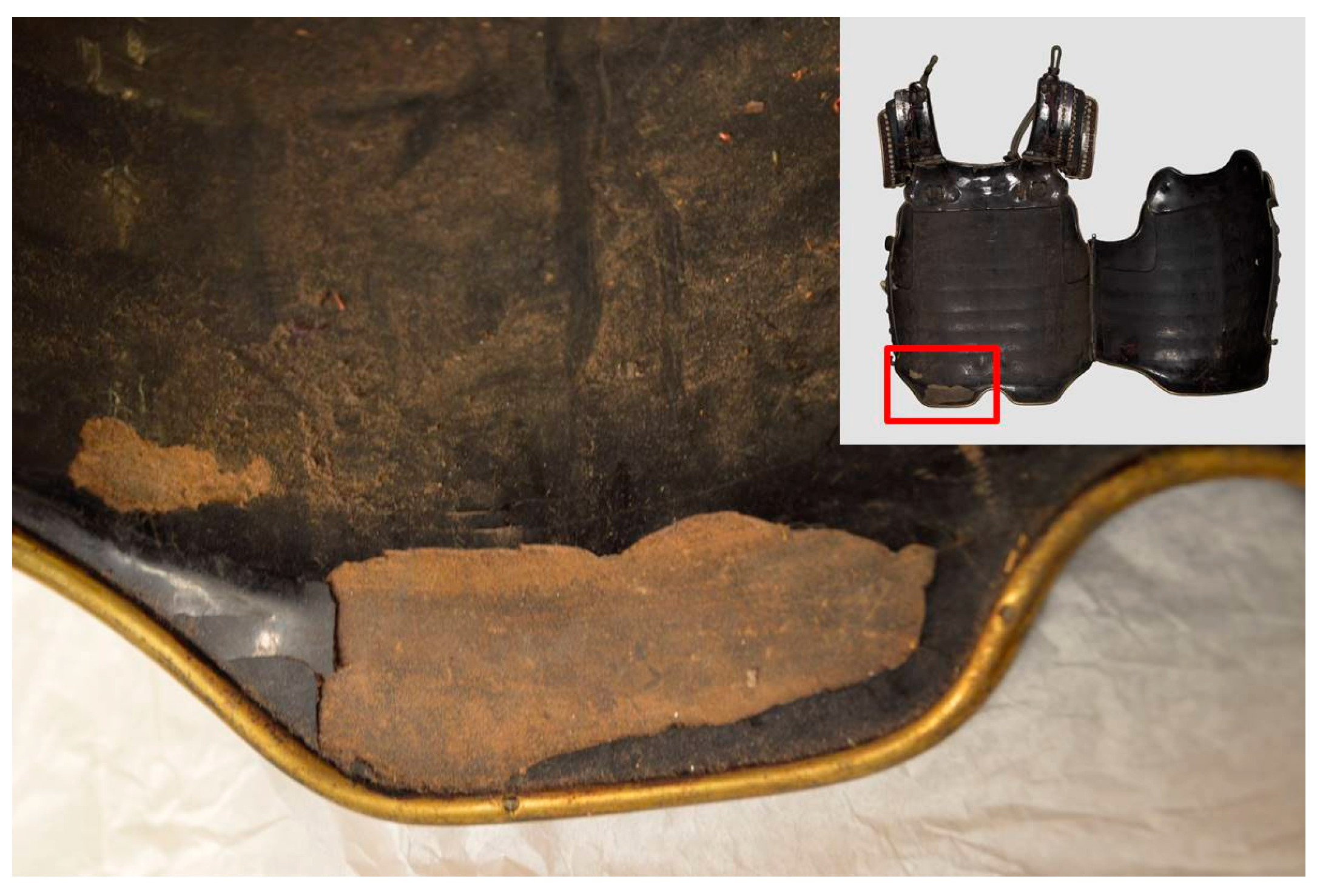 - Trento, M. The conservation treatment of the B54 Japanese Armour from the Royal Armoury in Turin. Re-adhesion of Japanese lacquer on metal. CeROArt. Conserv. Expo. Restaur. D’objets D’art 2017, 6. [Google Scholar] [CrossRef]