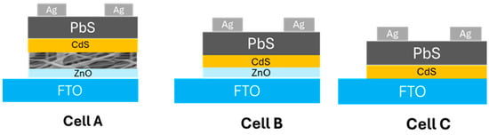 Cross-sectional schematics of the three device architectures evaluated. Cell A: FTO/ZnO compact layer (sol–gel)/electrospun ZnO nanofiber network/CdS (CBD)/PbS (CBD)/Ag top contacts; the nanofiber network acts as a functional interlayer to improve interfacial coverage and electron selectivity. Cell B: FTO/ZnO compact layer/CdS/PbS/Ag, used to isolate the effect of the compact ZnO without nanofibers. Cell C: FTO/CdS/PbS/Ag (no ZnO), serving as the baseline control. Schematics are not to scale.