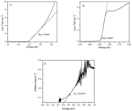 Bandgap determination by Tauc analysis. (a) ZnO: (αhν)2 vs. hν (UV–Vis), (b) CdS: (αhν)2 vs. hν (UV–Vis), (c) PbS: (F(R) hν)2 vs. hν. Fit windows are highlighted in red.