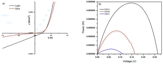 The current–voltage (I–V) characteristics of the solar cells were measured under simulated AM 1.5 G illumination (100 mW·cm−2) by scanning the applied voltage between −1.0 and +1.0 V, as shown in Figure 5a.