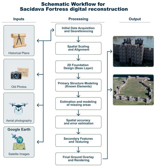 The 3D digital reconstruction of the Sacidava fortress was executed using Autodesk Fusion 360 (under a Valahia University of Târgoviște license). The process involved several methodical stages. It began with measuring the dimensions of the ruins using satellite images from Google Earth (publicly available software). These images were then imported into Fusion 360, where a 100 m fixed-size guiding line was drawn to facilitate the scaling of the satellite images, using a 100 m reference taken from Google Earth’s measurement function. Next, images of the 1980 plan of Sacidava after Scorpan [] were imported and scaled using the 20 m reference size from that drawing. This plan served as the basis for the 2D sketch design of the fortress foundation, followed by its 3D design, using approximate depth dimensions. The workflow continued with the 2D sketch design of the walls and columns, referencing the foundation, and their subsequent 3D design, where the height was approximated based on the specialized literature and the elements existing in the 1980 plan. The fortress was then completed by adding walls and columns to ensure it was square and closed, followed by the design of the defensive walls for the columns and walls. Finally, the 3D design included the fortress gates, the windows and exits of the fortress columns, and the creation and overlay of textures: specifically, fortress textures for the walls and columns and drone images for the ground texture. The schematic workflow for the Sacidava fortress is shown in Figure 2.