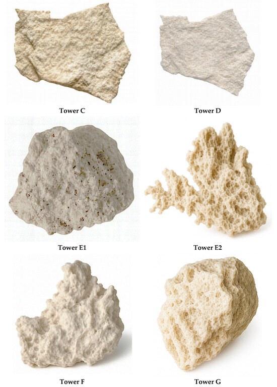 As material replicates (between-site), the independent surface fragments/areas per tower (n = 6 per tower) were spaced ≥ 0.5 m to avoid pseudo-replication. From every tower, from the same marked micro-areas, paired samples were measured before and after HAp treatment (repeated measures).