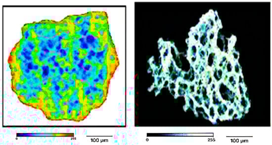 Simulated computed tomography (Pseudo-CT) has been achieved by image segmentation performed using ImageJ software for Mac V 1.54 Softonic International S.A. © 1997–2025, Barcelona, Catalonia, Spain [,,]. The stack composite was opened in software, using the split channel function in the hyper stack plugin. ImageJ is an open-source software used to process and analyze. ImageJ is used afterward for data processing and quantification [,]. CT is able to offer us information about pores, voids, or cracks, distributed throughout the matrix.