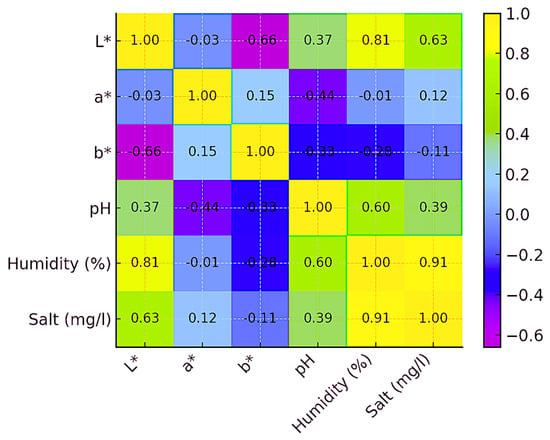 The chromatic parameters were measured using a CR-410 colorimeter from Konica Minolta, Tokyo, Japan, following the CIELAB standard []. These included Lx* for brightness (ranging from 0 for black to 100 for white), ax* for red/green variation (where +ax* denotes red and −ax* denotes green), and b* for yellow/blue variation (+bx* for yellow and −bx* for blue).