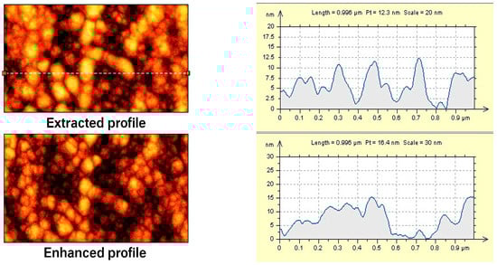 AFM surface topography (profilometry) of the non-treated mortar surface, before and after image enhancement. The left images show the original AFM scan (top) and its enhanced version (bottom), where surface grains and micro-reliefs appear more clearly defined. The dashed line indicates the location of the extracted height profile. The right plots illustrate the corresponding height profiles along this line, highlighting how image enhancement improves the visibility of local peaks and valleys and provides a clearer representation of the material’s nanoscale roughness.