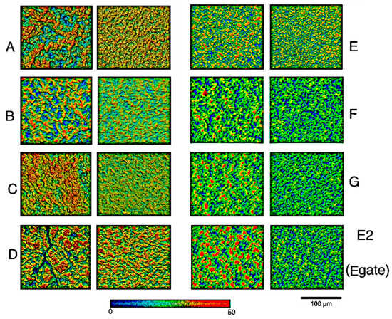 For AFM, 3 regions of interest (ROI) were selected (50 × 50 µm or 100 × 100 µm) per sample × 3 repeat scans/ROI (independent re-approach), resulting in 9 scans per sample. AFM acquisition (tapping) mode was set up to minimize surface deformation and target tip radius < 10 nm, setpoint of 70%–80% of free amplitude, and scan rate of 0.8–1.2 lines/s and 256 × 256 px. The surface parameters Ra (average roughness), Rq (root mean square roughness), and Rz (maximum height difference), which were automatically computed by PicoView 1.4 software (Version 1.14.4, Agilent Technologies, 800 Altamor Drive, Los Angeles, CA, 90045, USA), have been collected and processed.
