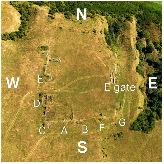 The experiments will start with the historical records concerning the fortress of Sacidava, which form an indispensable source for its economic, political, and military background in the Roman empire: particularly to date those known from the eastern Black Sea (province). As excavation of the fortress is unable to expose any endogenous interior architecture, comparative studies with contemporary fortresses are necessary. This serves to recover lost information on account of partial excavation. Such surveys can help reveal as yet unknown parts of the fortress: structures which have risen above ground level as a result of natural weathering. In view of the new findings, we were able to propose that one such Roman quay foot ruin is being traced in a low water level time for the Danube river observation []. The Roman fortress of Sacidava had a quay, used as an internal port (610 m in length), which was intended for entering warships or vessels. The fort, a cantonment on the Moesian Limes, had been used to control supply and transportation passing by the Roman frontier for hundreds of years. Today, practically the whole southern side of the encircling wall, and also in part the western side, a total length of some 200 m that had been most closely surrounded due to easy accessibility are left uncovered: on one side, from towers A to G; on the other, only from D to E (Figure 4). On the east is the entrance gate and some of the curtain at its north-eastern end. The towers have been noted with the letters of the alphabet in order of discovery [].