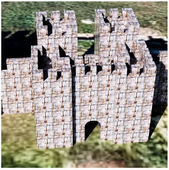 Under such context, the 3D technologies in archeology and cultural heritage are becoming extremely popular. The acquisition of this geometry can be performed using image capturing [], photogrammetric techniques, and photo surveying methods—LIDAR (other alternatives include laser scanning from helicopters or ground-based aerial inspections) [,]. To make an accurate digital model of the fortress in 3D, realistic wall and column textures are necessary. This involves a process that includes uploaded photograms depicting all of the fortress geometry and its textures (photos taken from different ground viewpoints or with a helicopter at low altitude), combined with historical research (architectural measurements, drawings of buildings, and printed materials found by earlier visitors) and 3D-modeling techniques that enable us to build a digital model of the fortress on our own computers [].