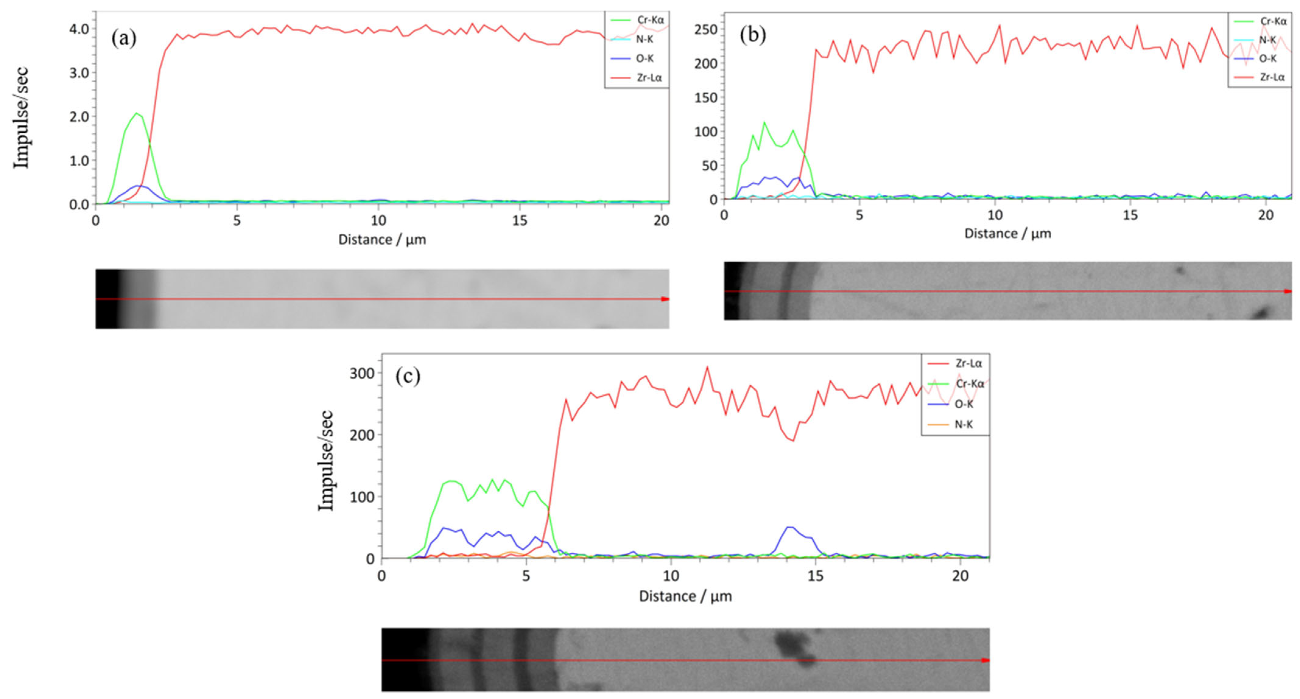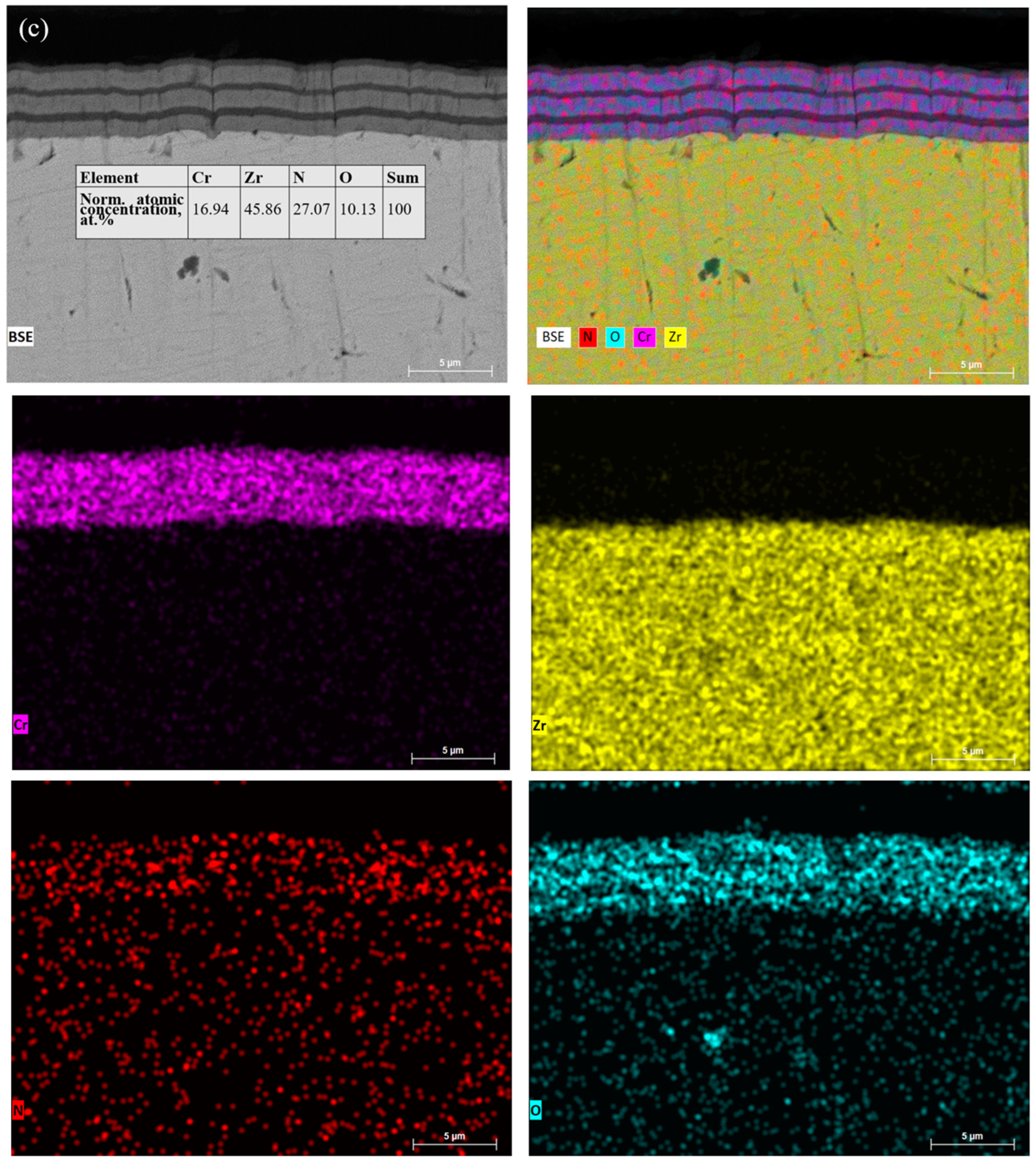 - Ma, X.-F.; Wu, Y.-W.; Tan, J.; Meng, C.-Y.; Yang, L.; Dang, W.-A.; He, X.-J. Evaluation of Corrosion and Oxidation Behaviors of TiAlCrN Coatings for Nuclear Fuel Cladding. Surf. Coat. Technol. 2019, 358, 521–530. [Google Scholar] [CrossRef]