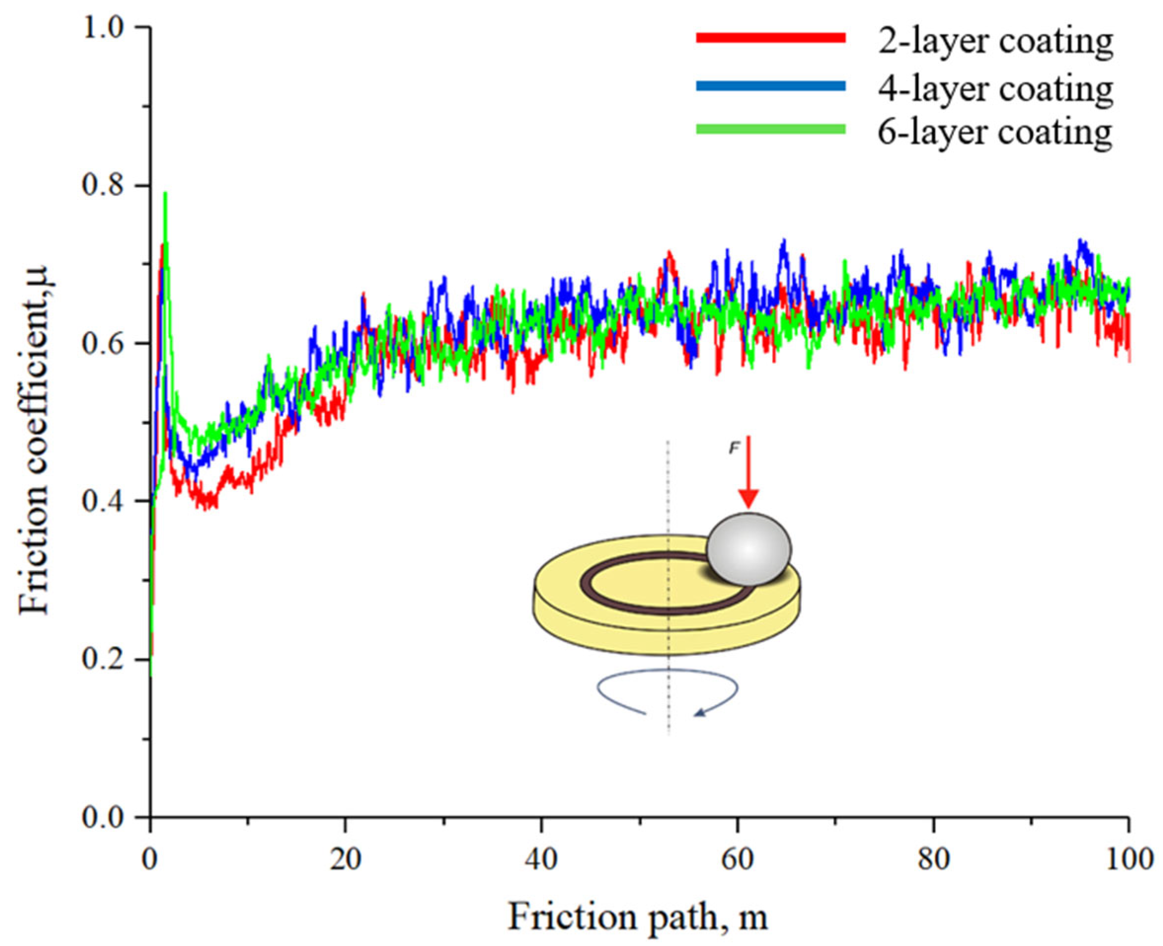| № | Number of Layers | µ (Average) | Wear Rate, mm3·N−1·m−1 | Wear Volume, mm3 |