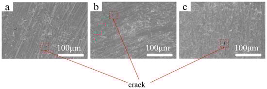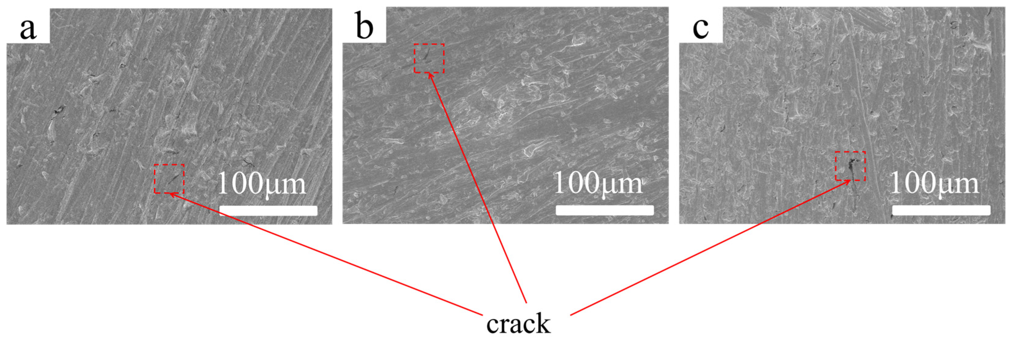 The surface morphology of the coatings prepared under different treatment conditions was further examined using SEM at 200× magnification. As shown in Figure 4a, when PVA was introduced based on the Optimized Processing (OP), the coating surface displayed noticeable inhomogeneity. The micrograph reveals blurred streak-like regions and uneven surface contrast, indicating irregular deposition and local thinning of the coating. The presence of faint grooves and discontinuous features suggests that PVA may disturb the deposition process by forming viscous aggregates, leading to an insufficiently compact coating accompanied by microdefects that weaken structural uniformity. In Figure 4b, after incorporating CS, the overall surface uniformity improved compared with the PVA-containing sample. However, the coating still exhibited scattered roughened areas and localized textural variations. These spot-like undulations imply that the macromolecular chains of CS partially hinder homogeneous nucleation during film growth, resulting in mild nonuniform deposition and regions where coating integrity remains suboptimal. In contrast, Figure 4c shows that the introduction of SHMP combined with Ce(NO3)3 produced a markedly smoother and more uniform surface. The SEM image exhibits minimal surface irregularities, and the coating morphology appears continuous with fewer visible defects. This improvement can be attributed to the chelating capability of SHMP, which stabilizes metal ions and promotes uniform deposition, while Ce(NO3)3 facilitates dense nucleation and defect sealing. Together, these effects contribute to forming a compact and homogeneous coating with enhanced protective potential.