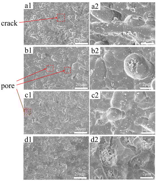 Scanning electron microscopy (SEM) was employed to further investigate the influence of different additives on the surface microstructure of the coatings. By analyzing the microscopic features, the uniformity, compactness, and distribution of defects could be evaluated, providing a theoretical basis for performance optimization. As shown in Figure 5a, the OP coating exhibited a relatively uniform and continuous surface with overall smoothness, though some pores and cracks were present. In Figure 5b, the addition of PVA led to the appearance of larger pits and irregularly deposited regions, with nonuniform particle distribution and localized agglomeration, resulting in increased surface roughness. This indicates that PVA may induce the formation of uneven gel-like structures during deposition, generating porosity, weakening interfacial adhesion, and thereby reducing overall protective performance. As shown in Figure 5c, the addition of CS produced a coating with improved continuity compared with PVA, but local spot-like defects and nonuniform deposition persisted, with some areas showing sparse particle distribution. This suggests that the bulky molecular structure of CS may hinder homogeneous deposition, giving rise to localized defects that compromise coating uniformity and protection. In Figure 5d, the incorporation of SHMP + Ce(NO3)3 resulted in a remarkably compact and well-ordered surface, with almost no visible pores or cracks, indicating excellent uniformity and continuity. The consistency with the results of Eslami, M et al. further confirms the reliability of this study []. This improvement can be attributed to SHMP suppressing heterogeneous deposition through chelation, while Ce(NO3)3 facilitated dense nucleation and defect sealing.