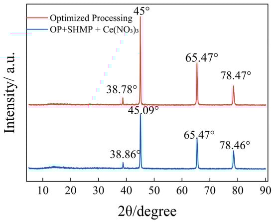 The XRD results in Figure 8 compare the diffraction patterns of the OP sample and the OP + SHMP + Ce(NO3)3 sample. Both groups showed distinct diffraction peaks at 38.7°, 45.0°, 65.5°, and 78.5°, corresponding to the (111), (200), (220), and (311) planes of the aluminum substrate. No additional crystalline phases were detected. Notably, after the introduction of SHMP + Ce(NO3)3, the peak intensities decreased, indicating enhanced surface coverage of the aluminum substrate and suggesting that the conversion coating is predominantly amorphous in nature. The agreement with the findings of Wang, L. et al. provides additional evidence for the reliability of these results []. This result is consistent with SEM observations of improved coating compactness.