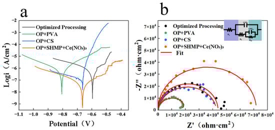 Further electrochemical results (Figure 10a,b) corroborated these findings: SHMP + Ce(NO3)3 coatings exhibited the best performance, with icorr reduced to 0.055 μA·cm−2 and |Z| significantly increased to 67.9 kΩ·cm2, indicating enhanced compactness and protective capacity. The corresponding electrochemical parameters are summarized in Table 2 for clarity and comparison. It is worth noting that this corrosion current density was not only significantly lower than that of the optimized baseline coating, but also superior to values reported in the literature. For example, Zhan et al. [] reported that a Ti–Zr–Ce coating prepared on 6061 aluminum alloy exhibited an icorr of 0.114 μA·cm−2, while Wang et al. [] found that a Ti–Zr conversion coating modified with salicylic acid and Ce(NO3)3·6H2O on 6061 aluminum alloy showed an even higher icorr of 0.207 μA·cm−2. These comparisons clearly highlight the superior corrosion resistance achieved in the present study by employing the SHMP + Ce(NO3)3 additive system. By comparison, the electrochemical behavior of the PVA coating was inferior to that of the OP sample, demonstrating weaker corrosion resistance. The CS-based coating provided slight improvement over OP, but its corrosion current density remained higher than that of the optimized OP coating. The results align well with those reported by Nam, D. et al., indicating the robustness and reliability of the findings []. Taken together, the corrosion and electrochemical results confirm that among the three additives, SHMP + Ce(NO3)3 provided the most pronounced enhancement in corrosion resistance, CS had a moderate effect, and PVA was the least effective, even impairing overall protective performance.