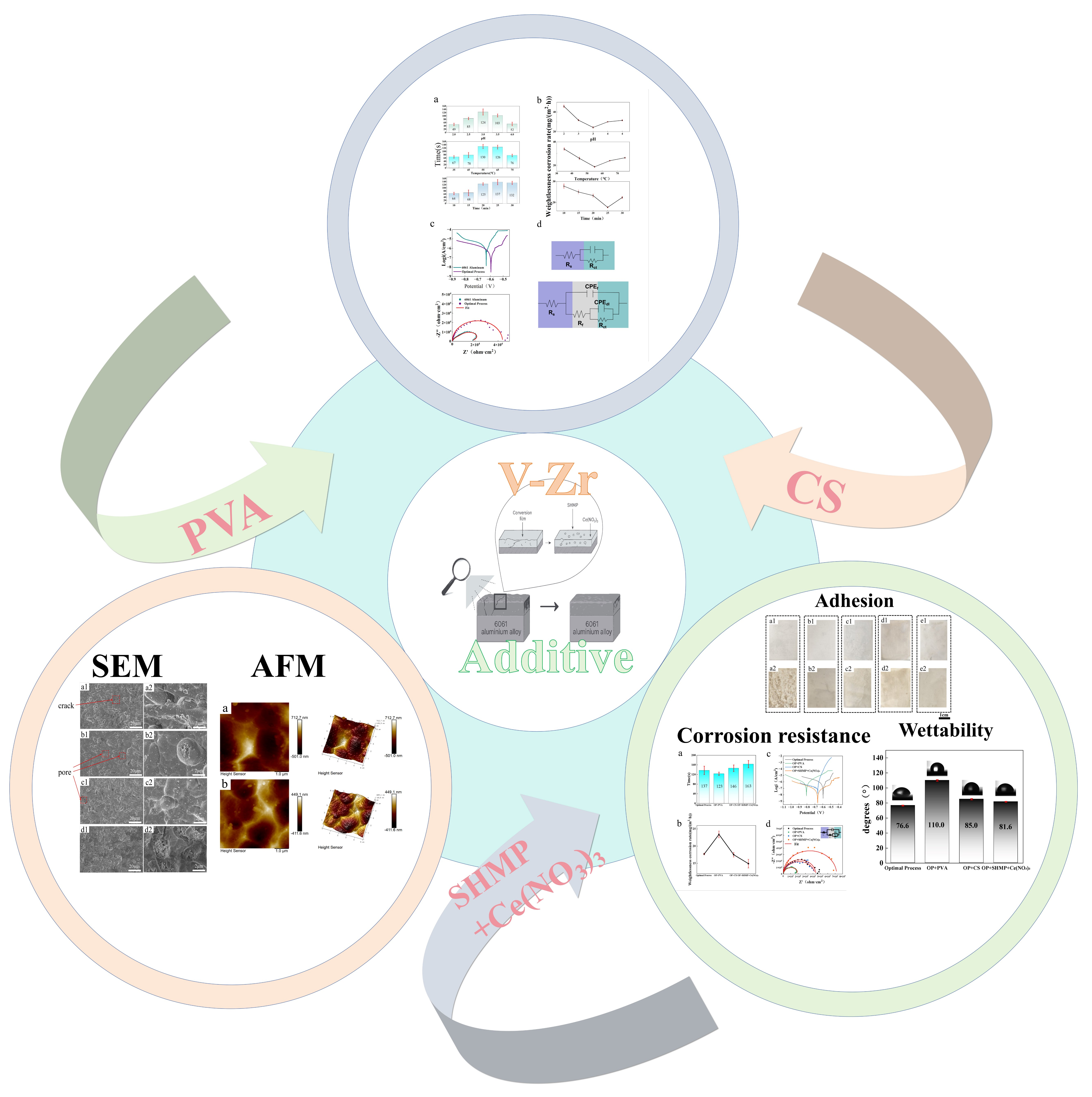 Vanadium–zirconium conversion coatings were successfully fabricated on 6061 aluminum alloy via in-situ chemical conversion. The characteristics, formation mechanism, and performance of the coatings were systematically investigated, with emphasis on the effects of solution pH, reaction temperature, and immersion time.