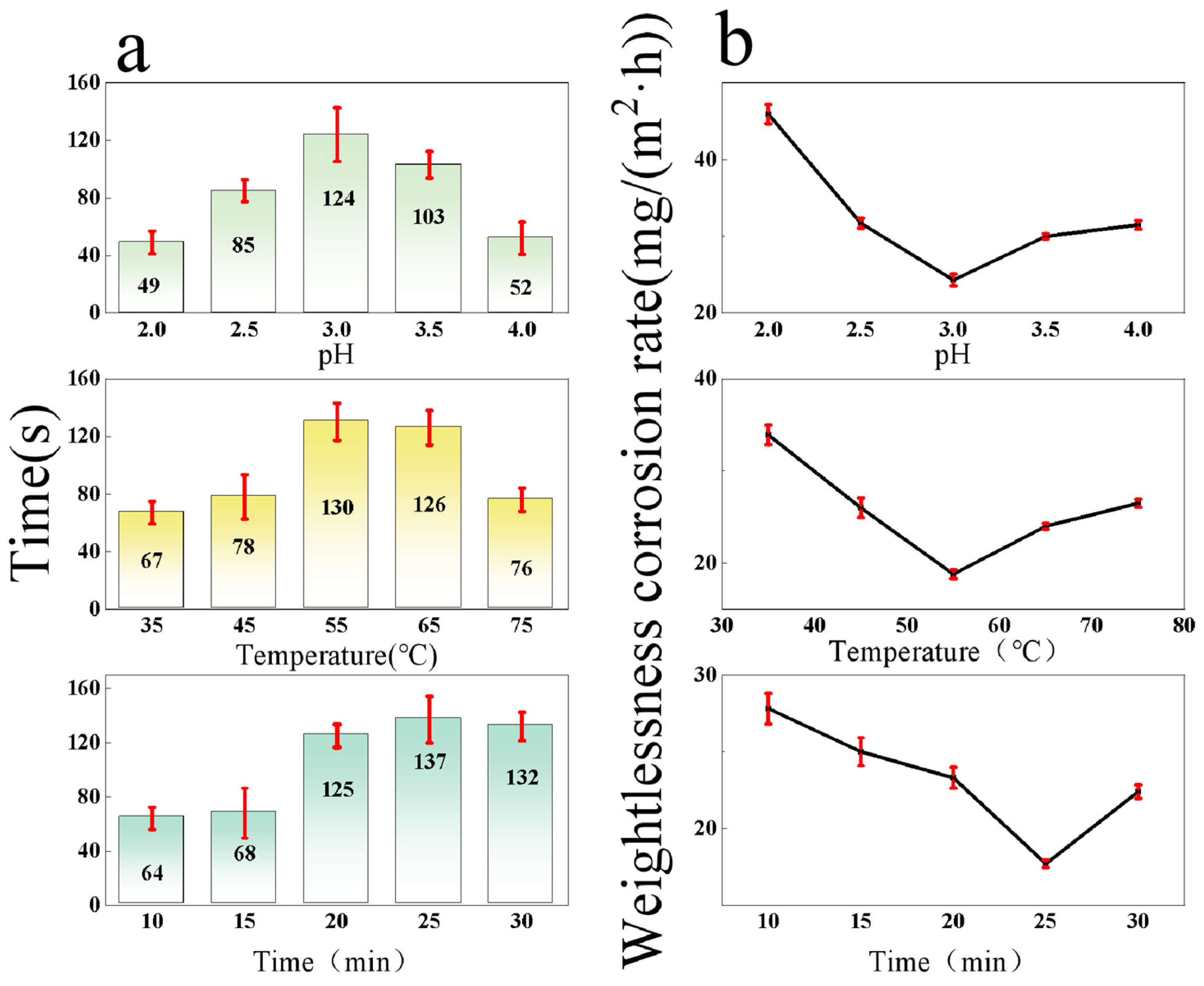 In this study, a vanadium–zirconium composite conversion system was constructed using sodium metavanadate and potassium hexafluorozirconate as precursors. By systematically adjusting three critical processing parameters—solution pH, reaction temperature, and immersion time—the coating performance was optimized. The results of the copper sulfate drop test (Figure 1a) and weight-loss corrosion test (Figure 1b) indicate that the optimal conditions for preparing the vanadium–zirconium mixed-salt conversion coating are pH = 3, reaction temperature 55 °C, and immersion time 25 min. Under these conditions, the coating exhibited excellent corrosion resistance.