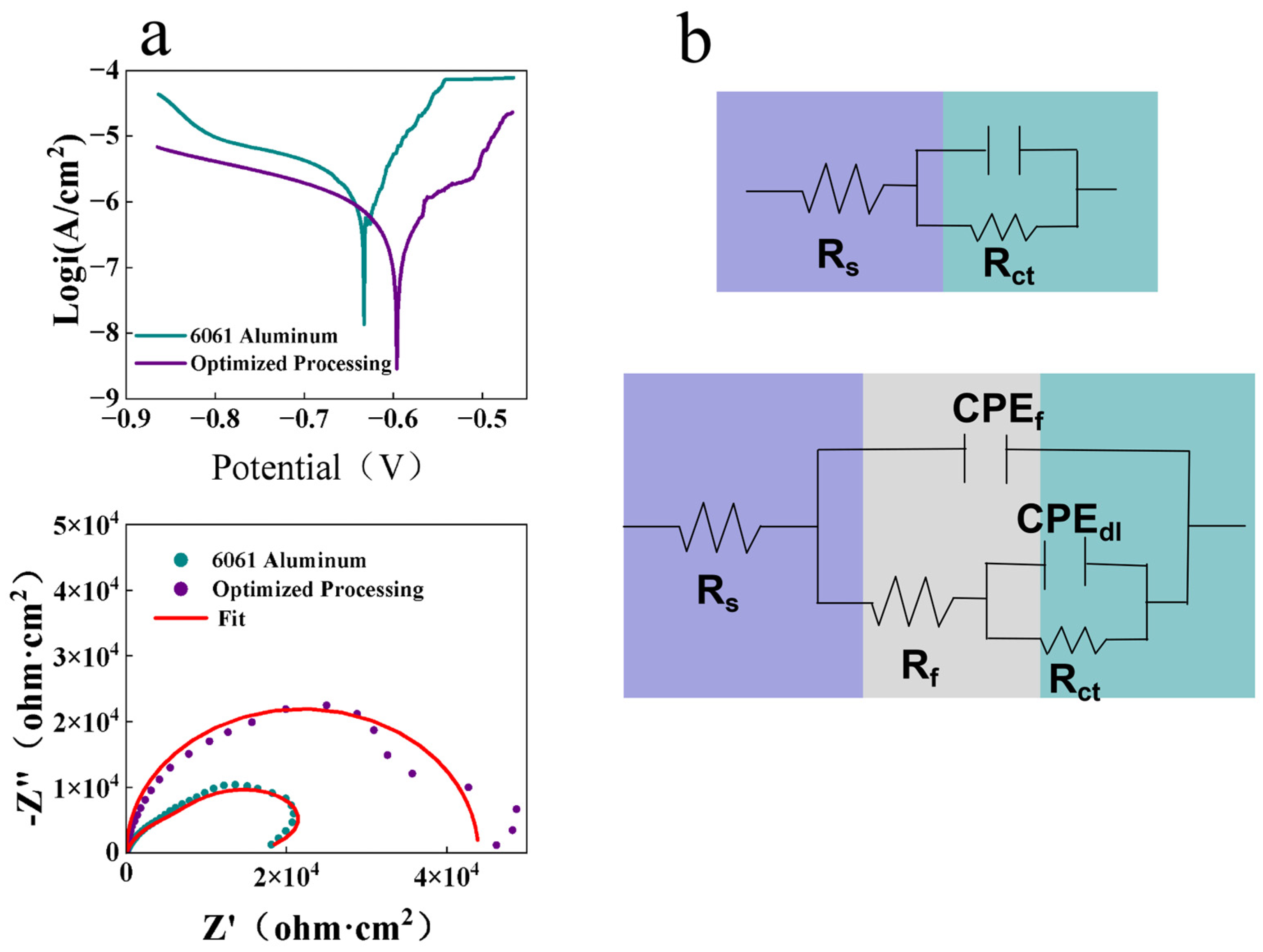 (a) Electrochemical measurements of the substrate and the Optimized Processing (OP); (b) Equivalent circuit.