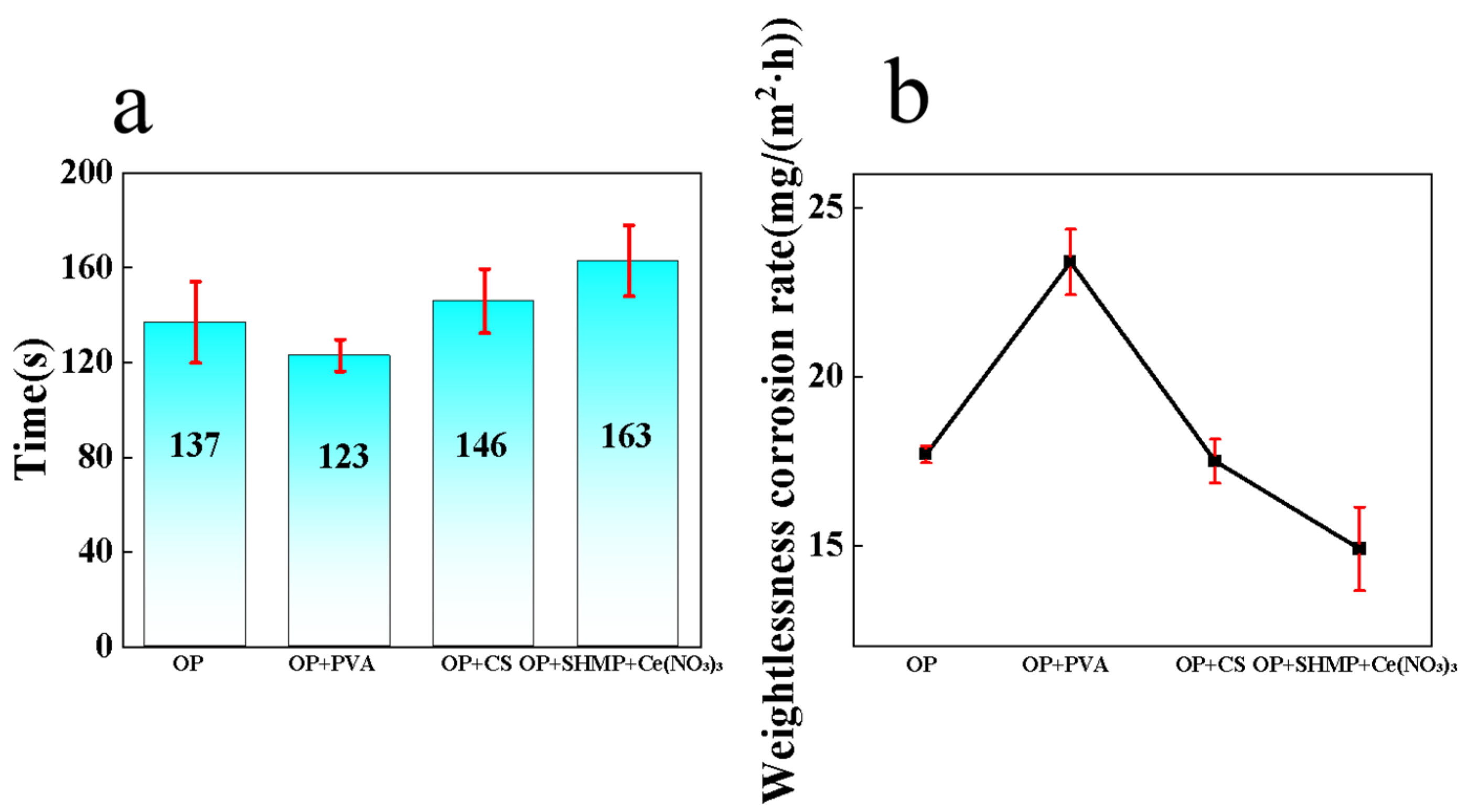 Corrosion resistance with different additives: (a) CuSO4 droplet test—time to color change, (b) weight-loss corrosion test—corrosion rate.