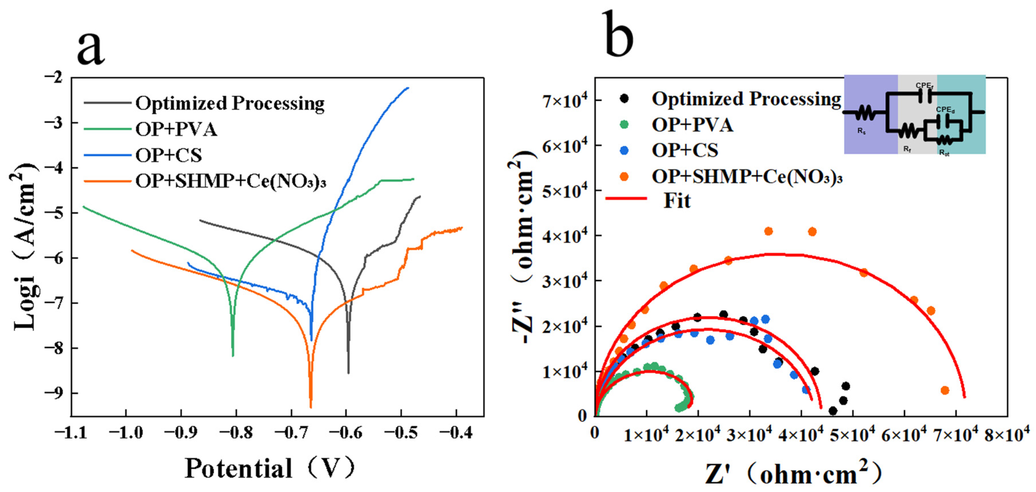 To further evaluate the influence of different additives on the corrosion resistance of the coatings, weight-loss corrosion tests and CuSO4 droplet tests were conducted, complemented by electrochemical analyses. As shown in Figure 9a,b, the specimens prepared with 0.1 g/L Ce(NO3)3 and 0.5 g/L SHMP exhibited the best corrosion resistance, with the lowest weight-loss rate (0.0149 g/(m2·h)) and the longest CuSO4 droplet resistance time (163 s). In contrast, coatings prepared with CS showed only moderate improvements in both corrosion rate and droplet resistance time, while those prepared with PVA not only failed to enhance protection but even decreased corrosion resistance. Comparable outcomes documented by Guo, H. et al. lend strong support to the reliability of our conclusions [].