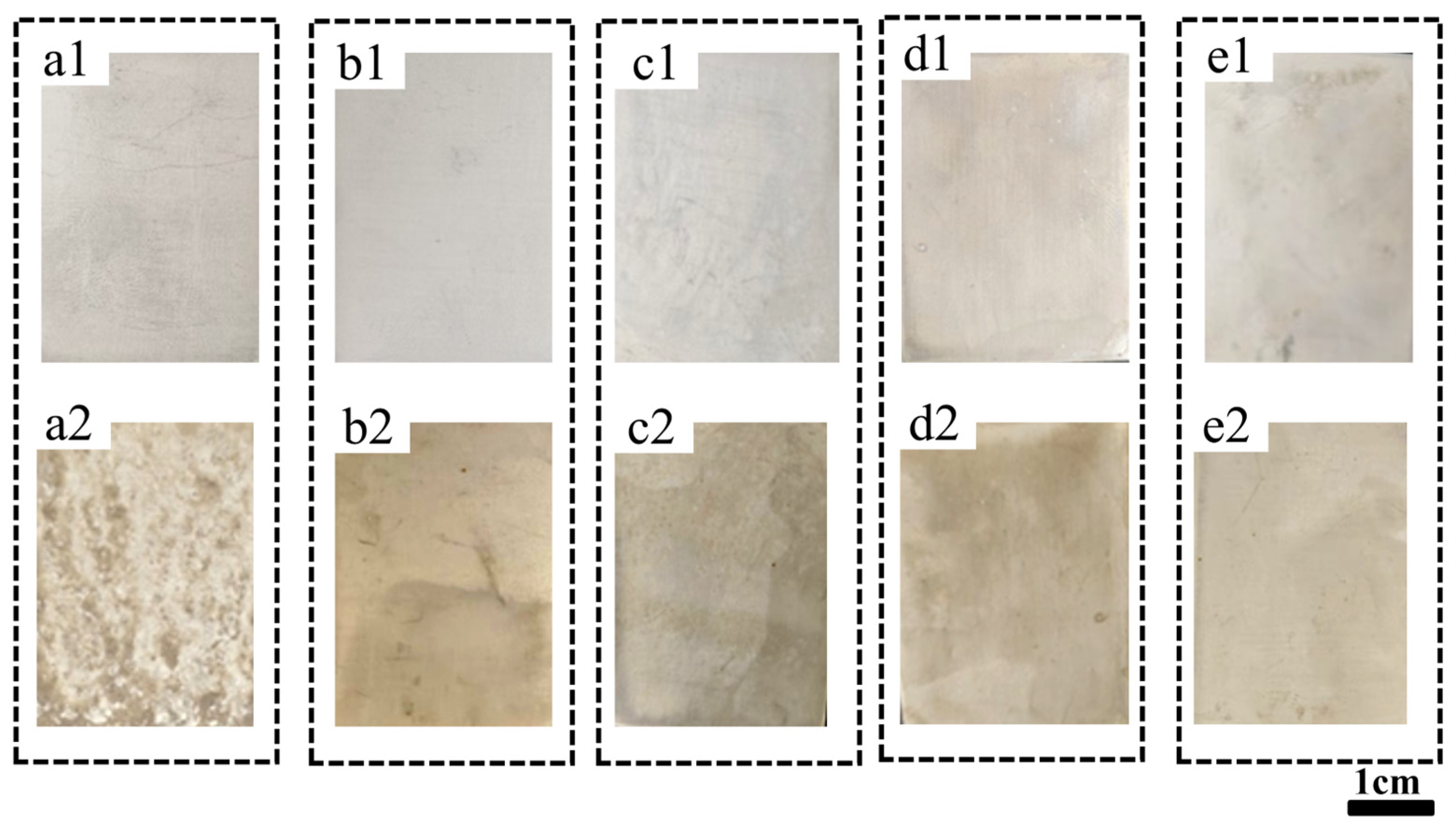 Neutral salt spray test: (a) Al 6061 substrate, (b) OP, (c) OP + PVA, (d) OP + CS, (e) OP + SHMP + Ce(NO3)3. “1” represents the sample before testing, “2” represents the sample after 72 h of exposure.