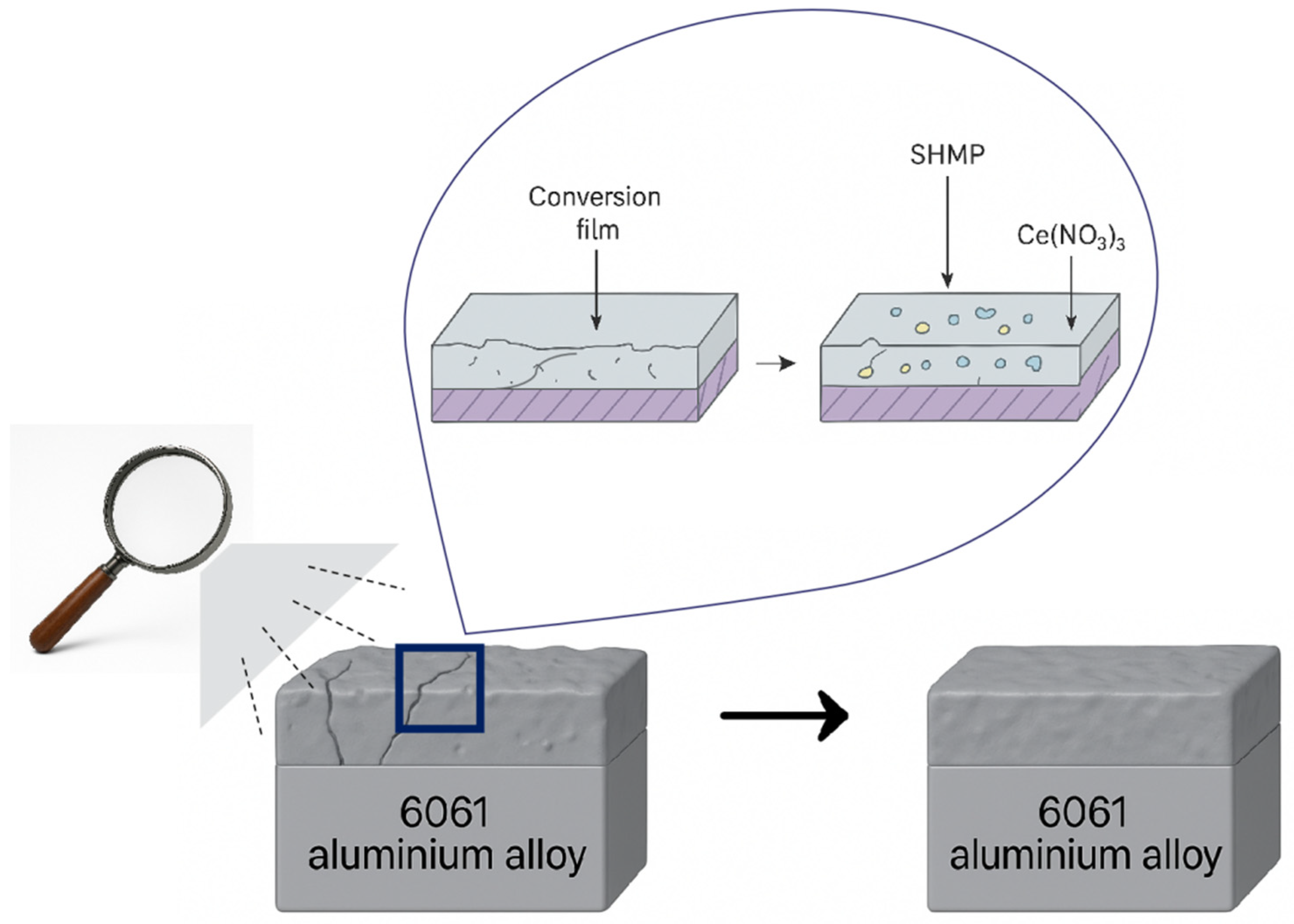 Electrochemical and corrosion performance tests (Tafel polarization, EIS, weight-loss, CuSO4 droplet, and salt spray tests) established the intrinsic link between structural evolution and protective behavior. Although PVA enhanced hydrophobicity, its non-uniform and porous structure caused a decline in corrosion resistance. CS imparted moderate improvements but was still restricted by local defects. The SHMP + Ce(NO3)3 process demonstrated the most comprehensive corrosion resistance, with a significant reduction in corrosion current, a substantial increase in |Z|, and no apparent corrosion observed in the salt spray test. These results were markedly superior to those of other processes, underscoring the effectiveness of a dense and continuous coating in impeding electrolyte penetration and retarding localized corrosion. Finally, the interfacial adhesion tests indicated that additives generally enhance the bonding strength between the coating and the substrate, with the SHMP + Ce(NO3)3 process providing the most pronounced improvement, thereby further consolidating the stability and practical applicability of the conversion coating.